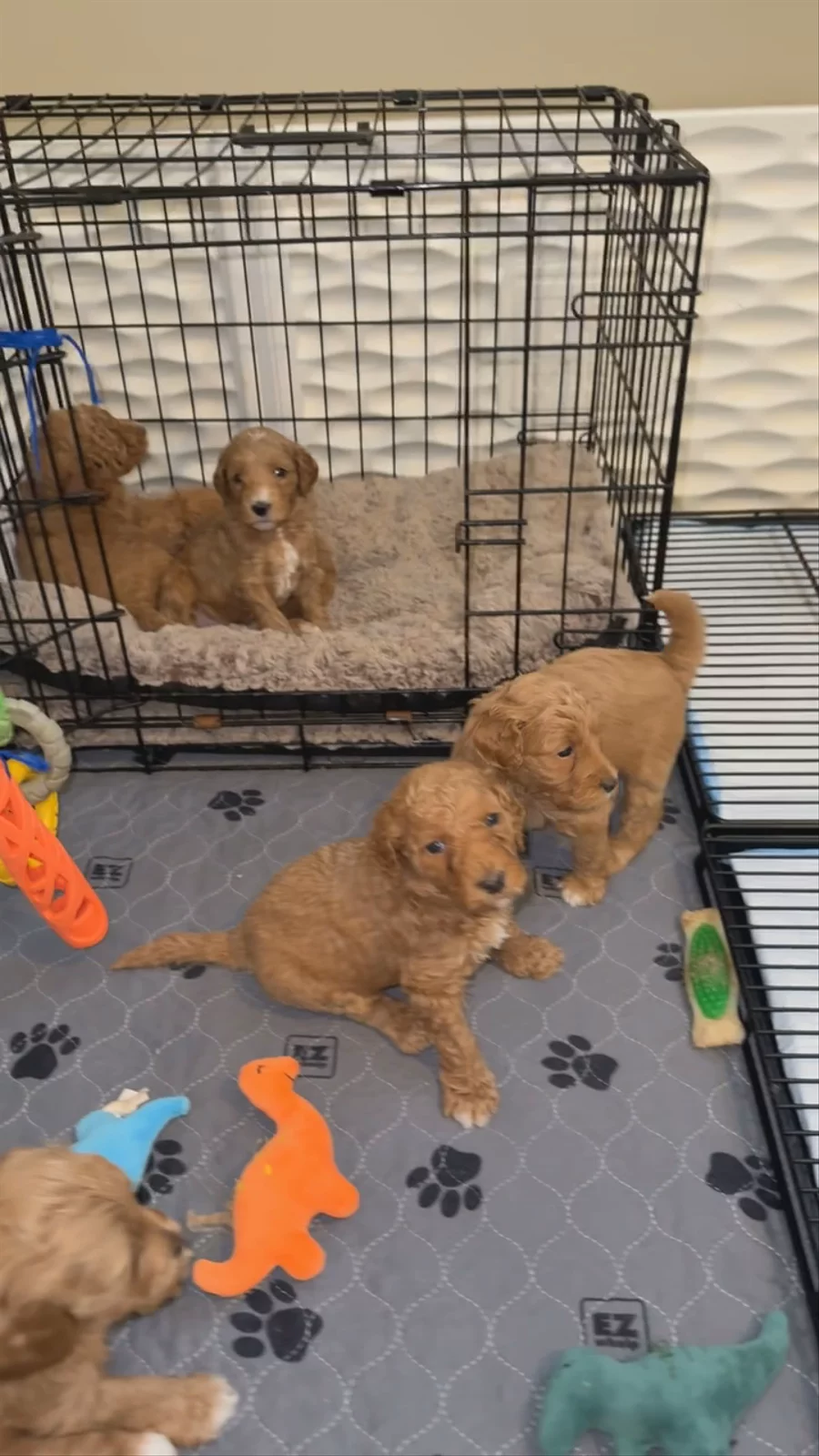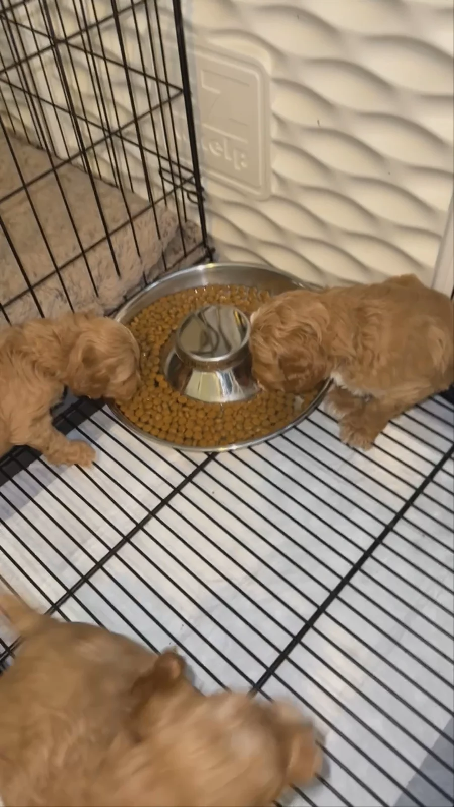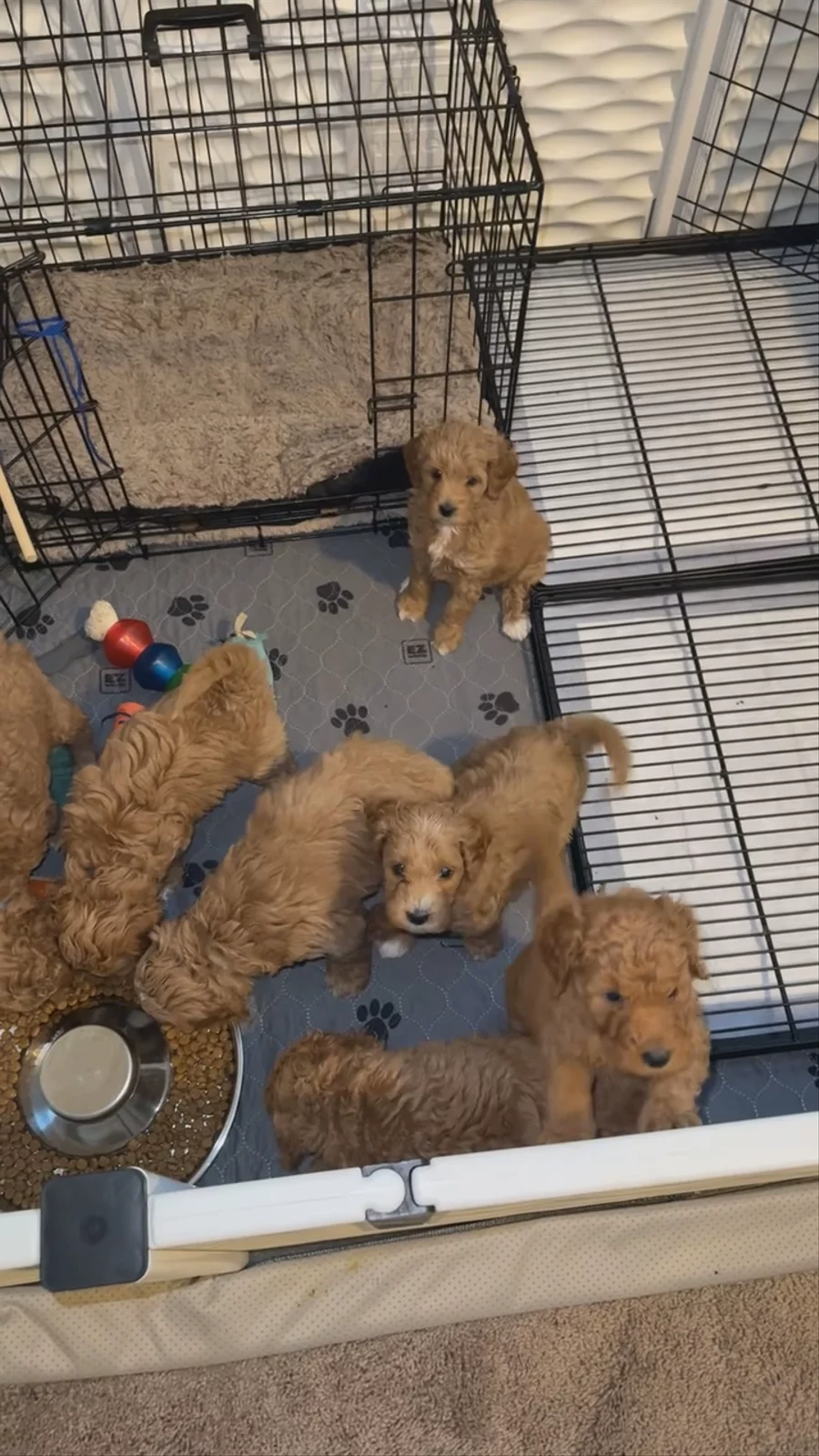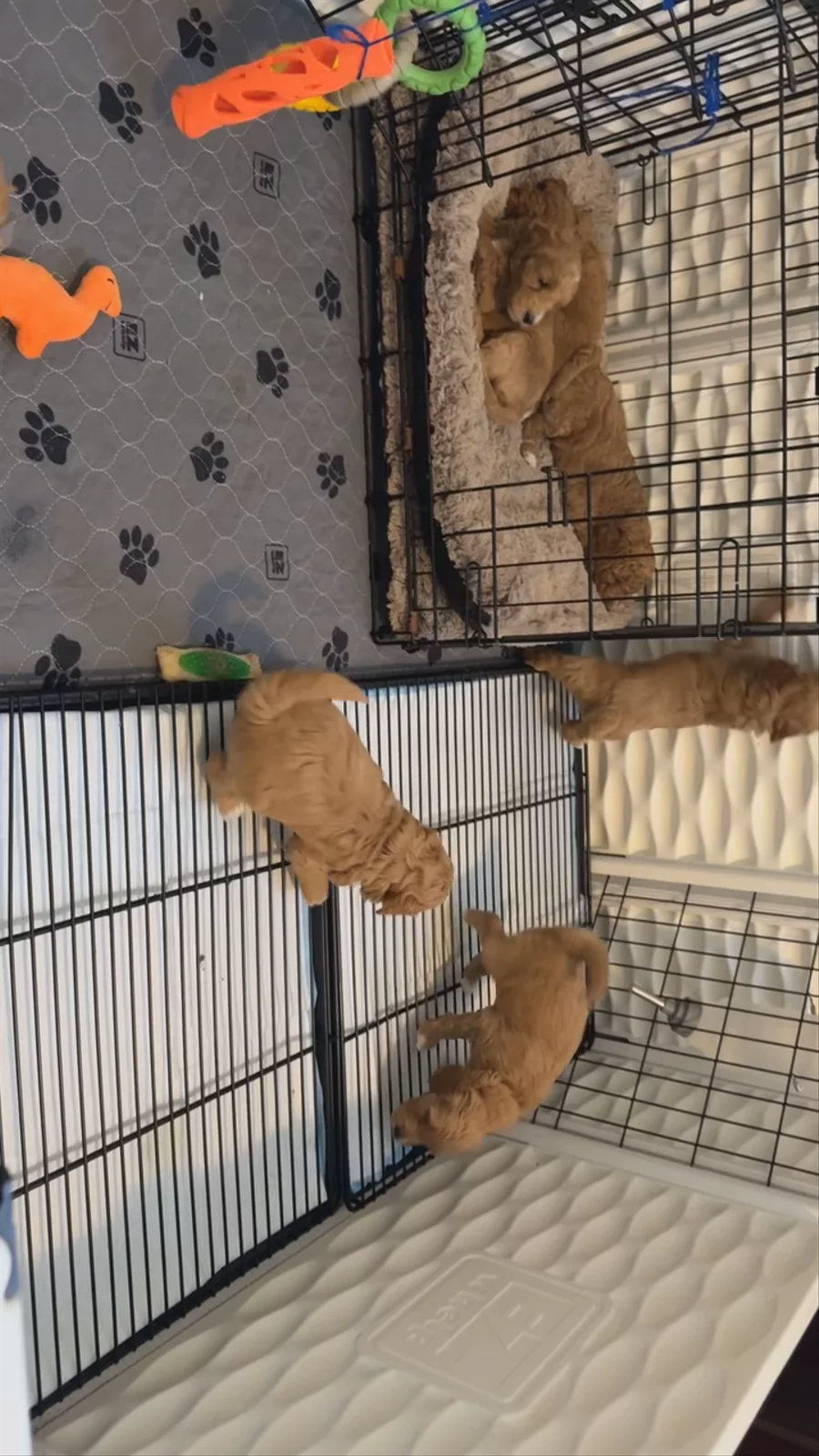 Puppies are officially four weeks old and we are introducing them to the crate. It has been less than 24 hours and are already going in and out on their own. Started to be interested in drinking out of the water bottle and are doing great on Party training.