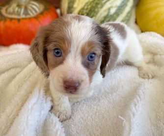 Olive is our sweet non pointed black dapple. She has brindle on her feet and legs. She is a show stopper with her blue eye. She is so sweet and a wonderful baby. She is AKC registered.