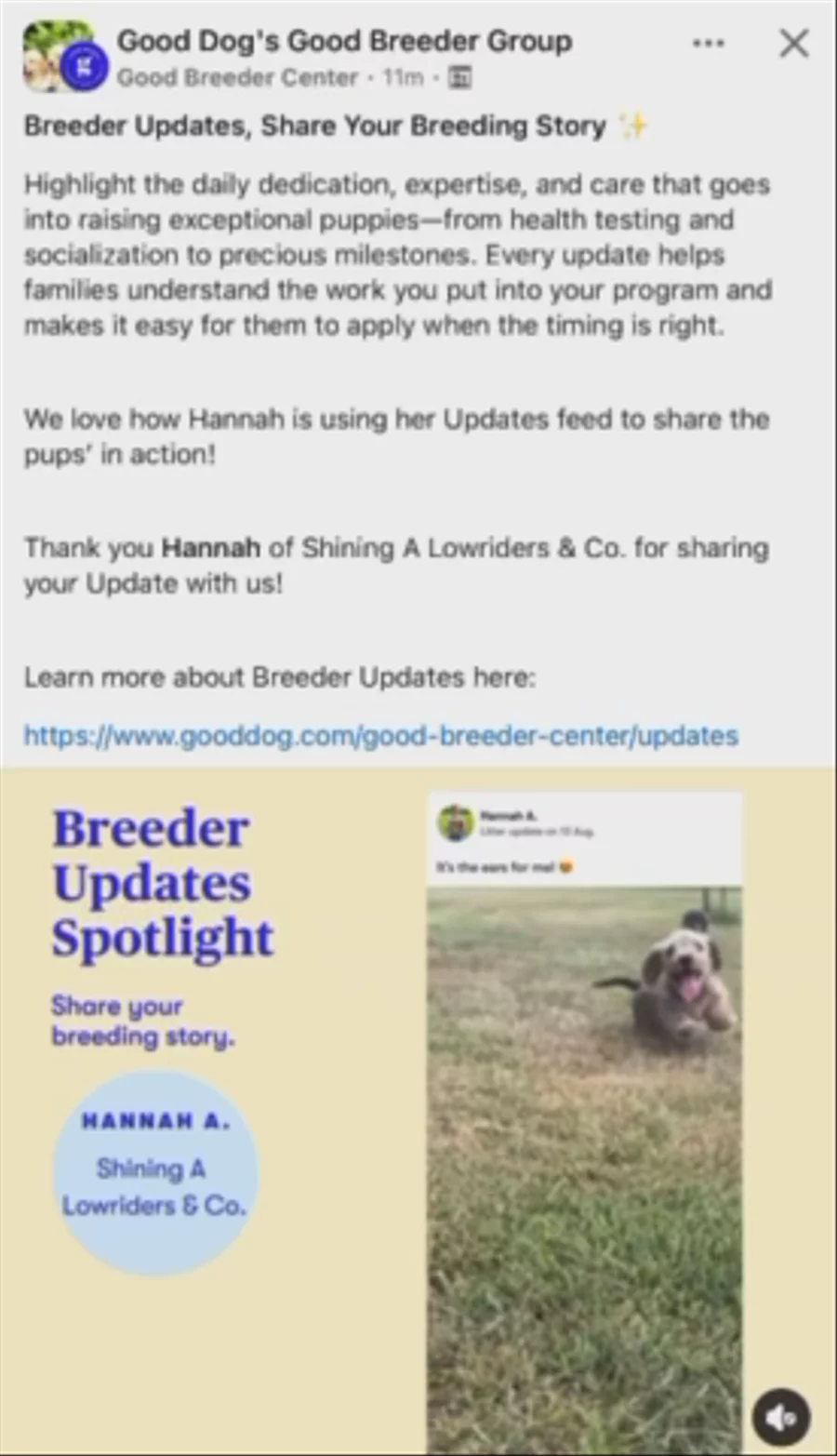 Hannah has been certified by Good Dog’s screening team for responsible and trusted breeding practices. When you’re ready to reach out, feel free to ask any questions about the breed, their program, or specific puppies.