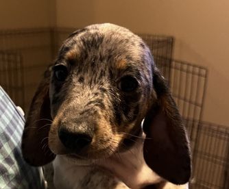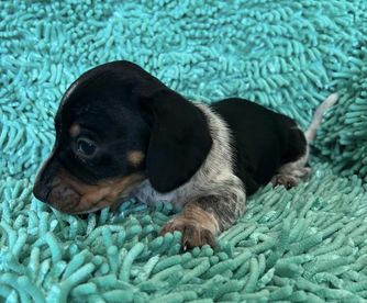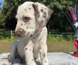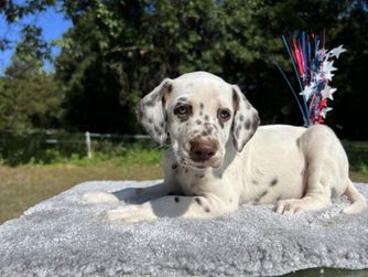 Our Dachshund puppies include red, chocolate, chocolate and tan, black and tan, and dapple. Dalmatian puppies include white and liver brown and white and black. Colors will vary depending on the parent dogs.