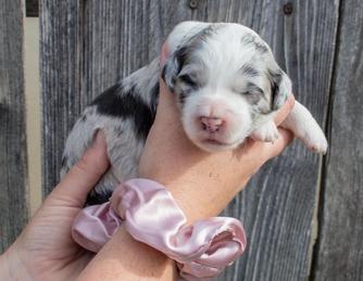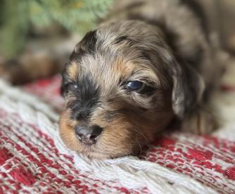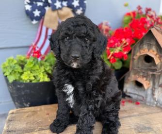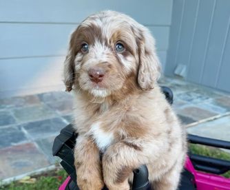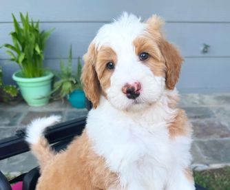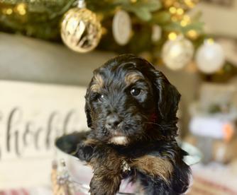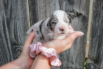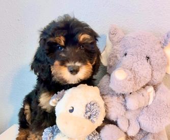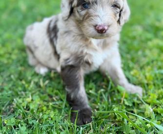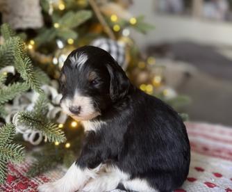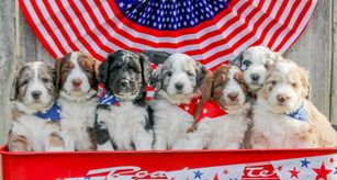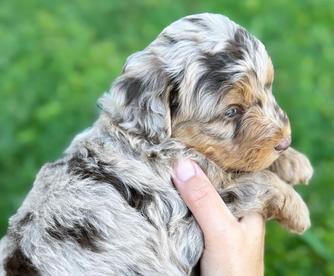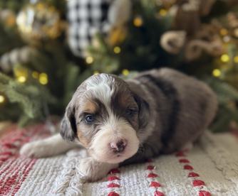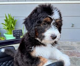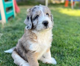 Our Bernedoodle puppies include brown, brown and white, black, black and white, tri-color, phantom, blue merle, and merle. Aussiedoodle puppies include apricot, blue merle, red merle, red phantom, and red tri-color. Colors will vary depending on the parent dogs.