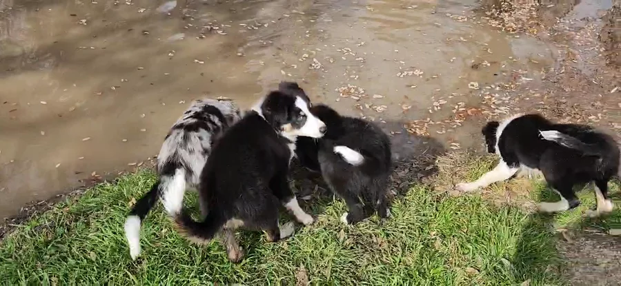 First day on the pond and running free with older puppies.