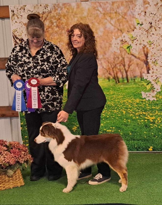 Eiro is a doll! So sweet, taking new things in and just wants to please. Has only been shown one weekend, but won winners B and is going to start on her new career in performance when her puppies find their new homes. She is a great momma too.