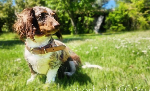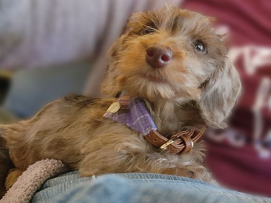 Meet Brynlie, our miniature wire-haired chocolate and tan dapple dachshund 🥰