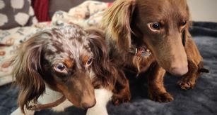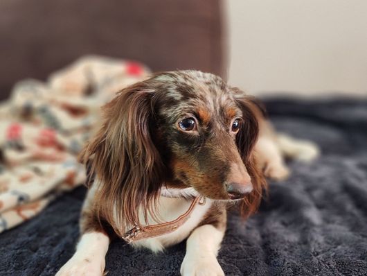 Freya is a beautiful long-haired chocolate and tan dapple piebald miniature dachshund. She is such a cuddlebug and loves being pampered at home. She is a very sweet, but also very protective of her own.