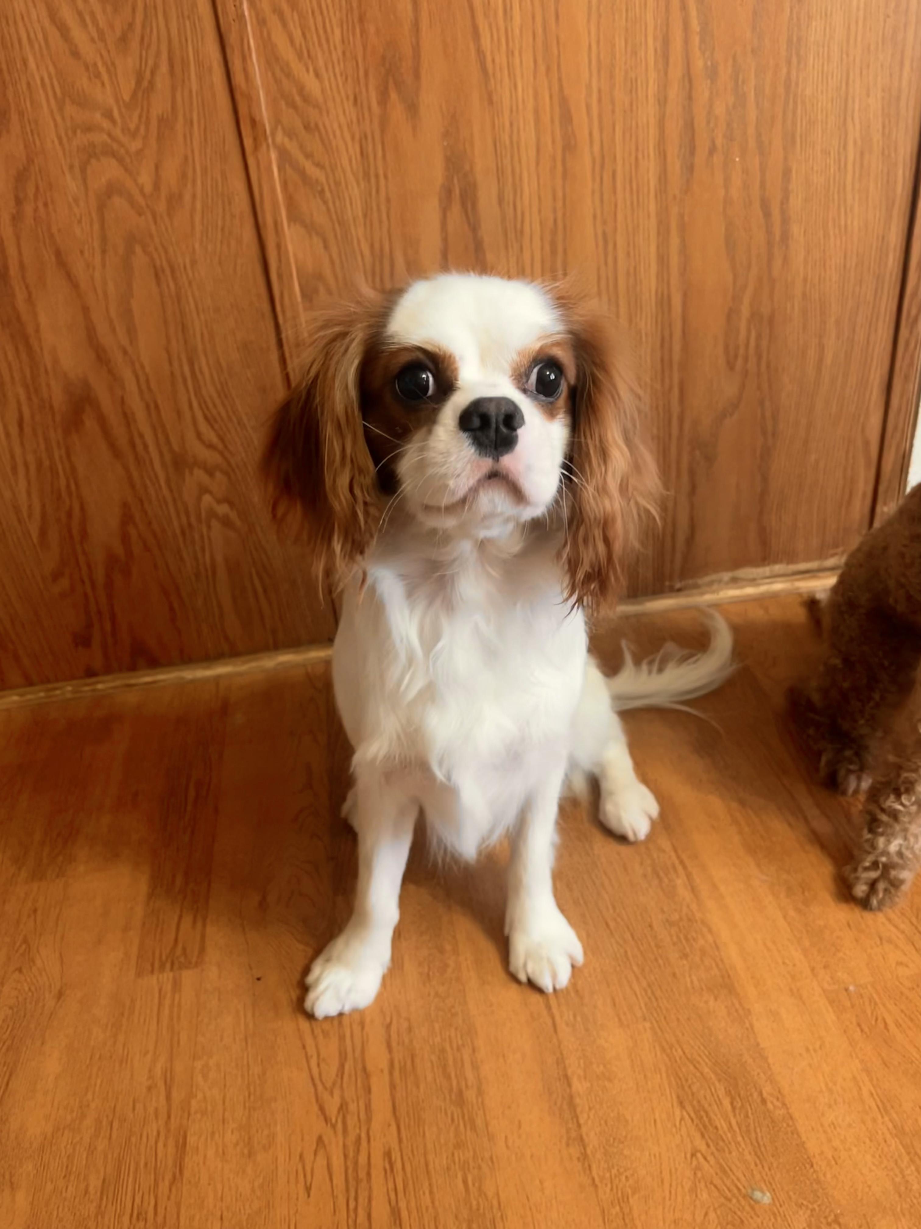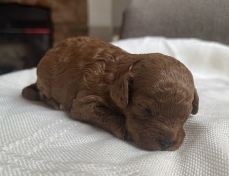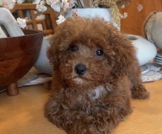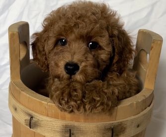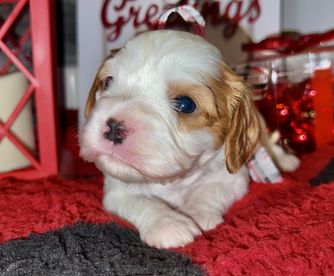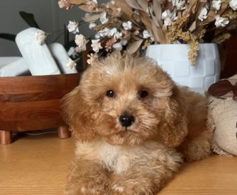 Our Poodle puppies are red. Cavapoo puppies include apricot, red, and black. Cavalier King Charles Spaniel puppies are blenheim. Colors will vary depending on the parent dogs.