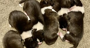 Our puppies include blue cream and white, red and white, brindle and white, black tan and white, and black and white. Colors will vary depending on the parent dogs.