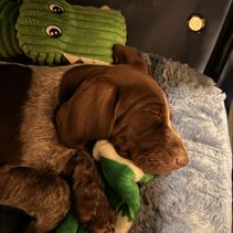 Sage, the mother to the puppies is the heart of our program with a pedigree that includes champions, master and junior hunting titles. Her exceptional bloodline gives her the qualities of a phenomenal dog: loving, kind, and incredibly loyal at home with our three boys. Her spirit and performance offer the best of both worlds loving family companions and top-notch hunting partners.
