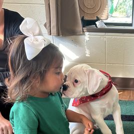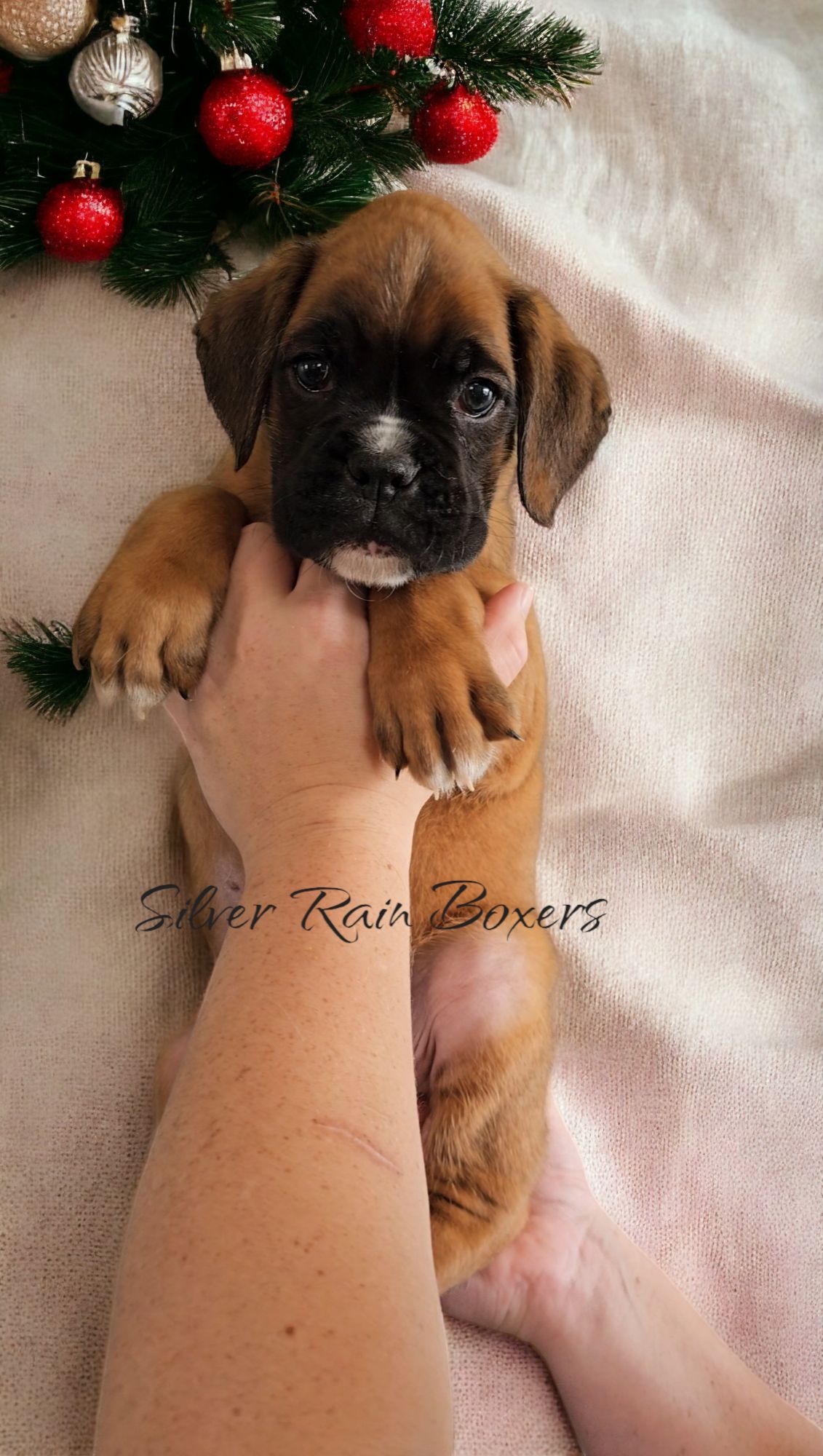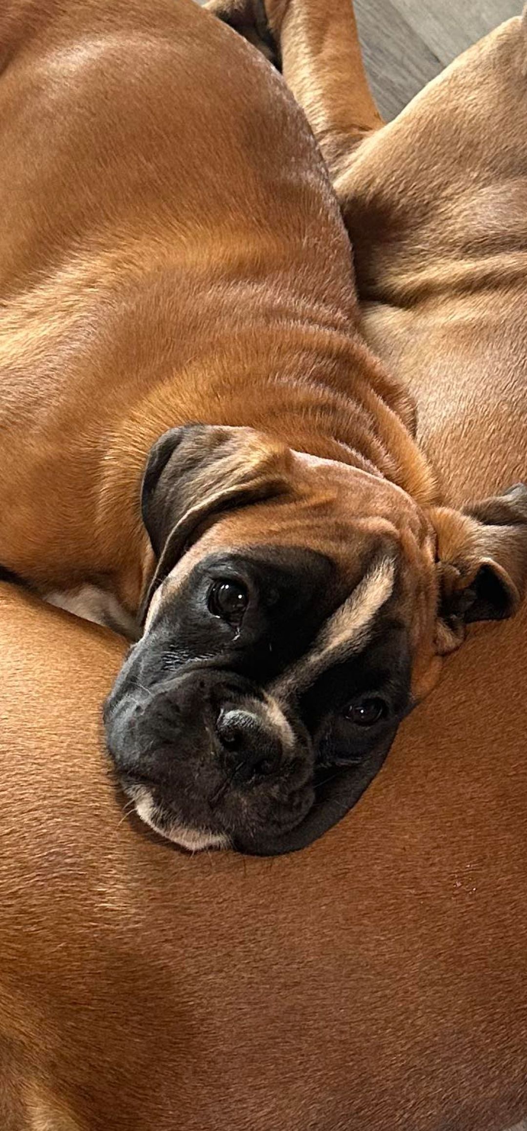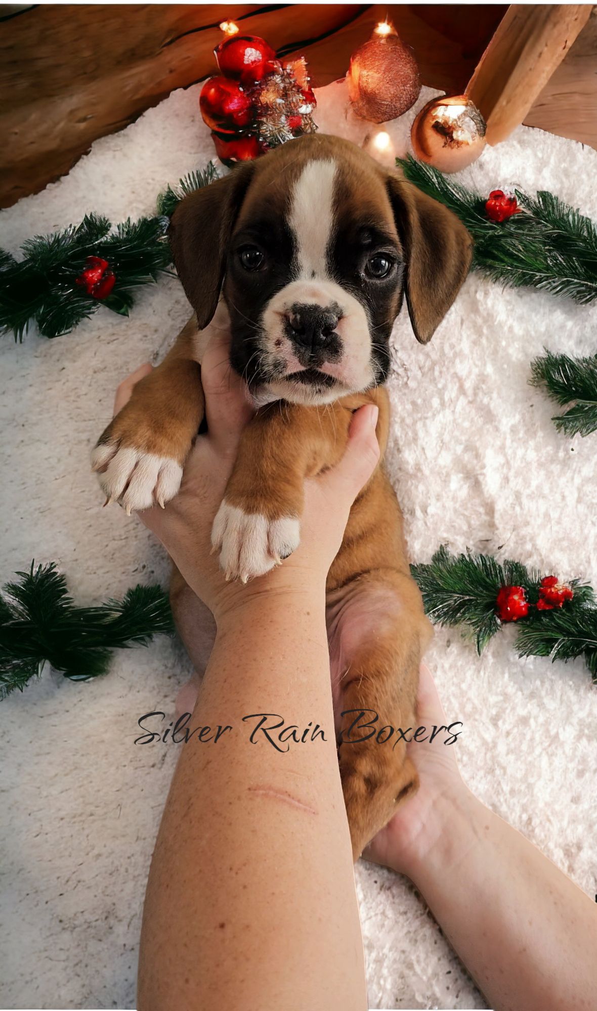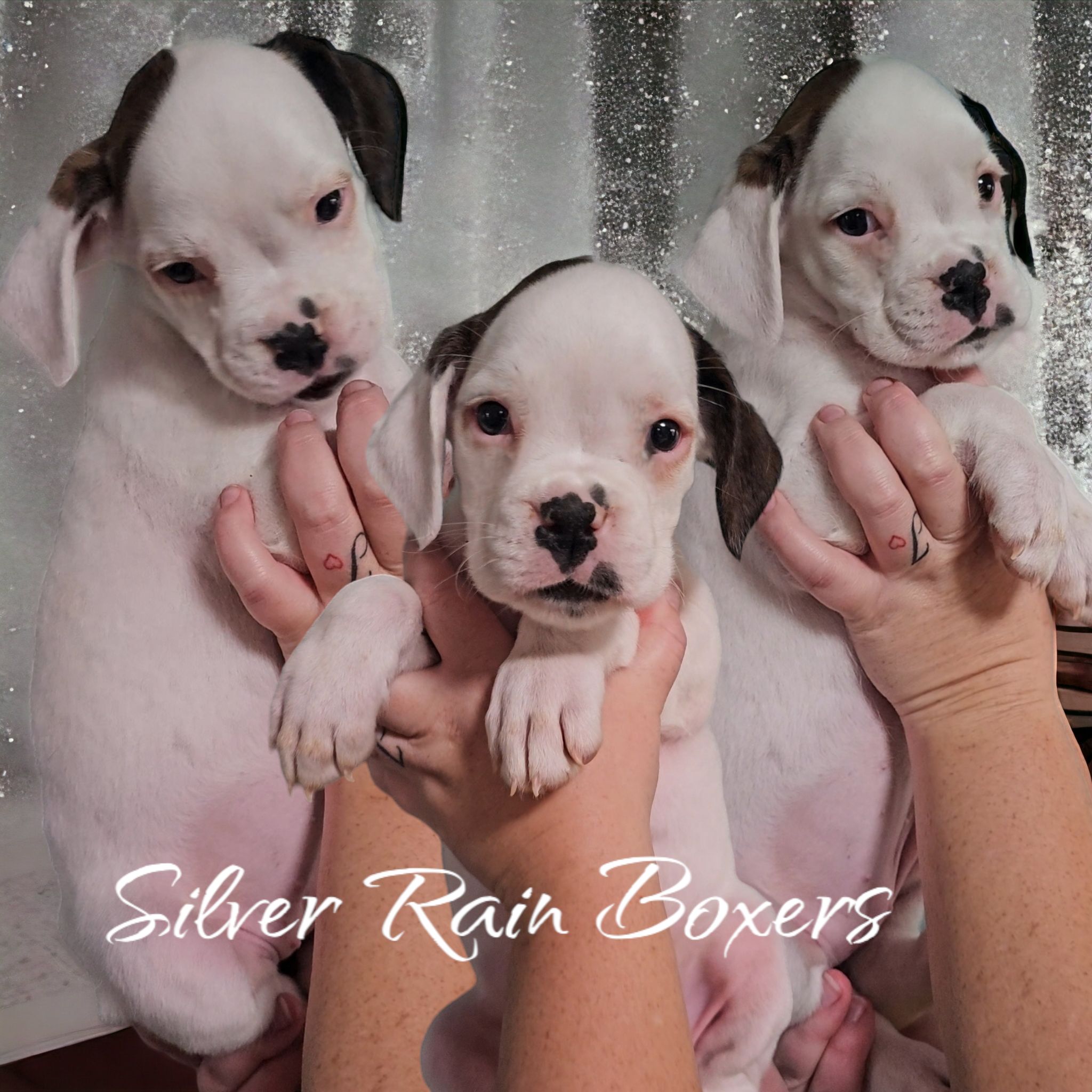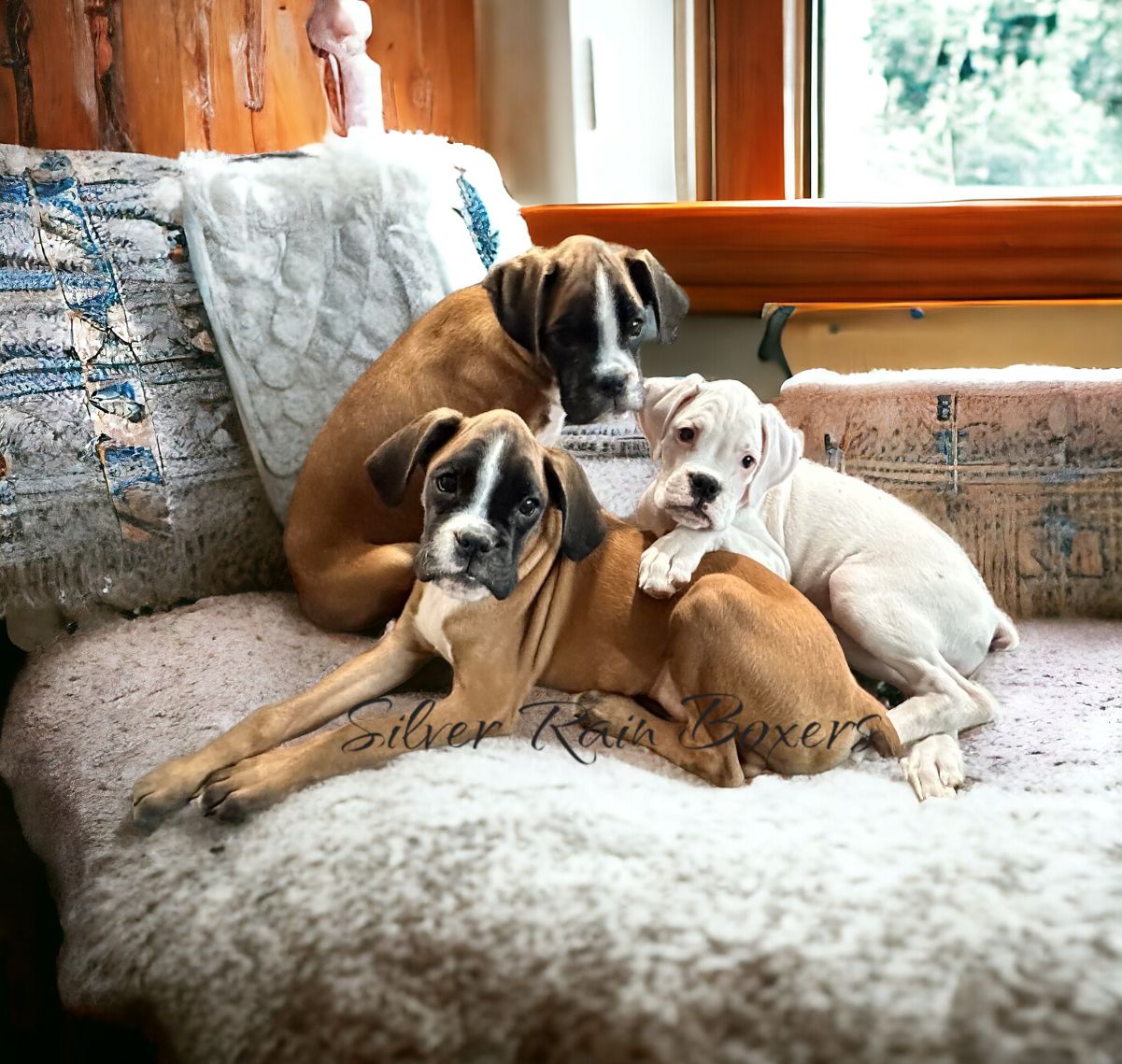 We are so happy with our puppy Koa from Silver Rain!! Dannielle made this whole process a joy. We loved getting regular updates and photos. She answered all our questions so quickly. She got us connected with the transport process that was best for our lil guy and worked for us from Nashville to California. One of our biggest concerns was finding a well-balanced, healthy boxer puppy who would fit in with our household. We have an older boxer and 2 grandkids who live with us and we work from home. Koa is so well balanced. He has been a dream to potty train. He was going to the back door within the first week. Now 3 weeks in he is sleeping in his crate all night and potty trained. He adores the kids and is so gentle. Our 7-year-old boxer male is in love and vise versa. They are inseparable. Thank you Danielle!! I highly recommend getting a puppy form Silver Rain. She is one of the good ones!!