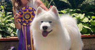 Maeve is an AKC Champion! She is a fun loving, silly, cuddly girl. She has already won an OHBIS, and a specialty from the classes. She has it all, structure, beauty and temperament! She is a Samoyed fanciers dream!