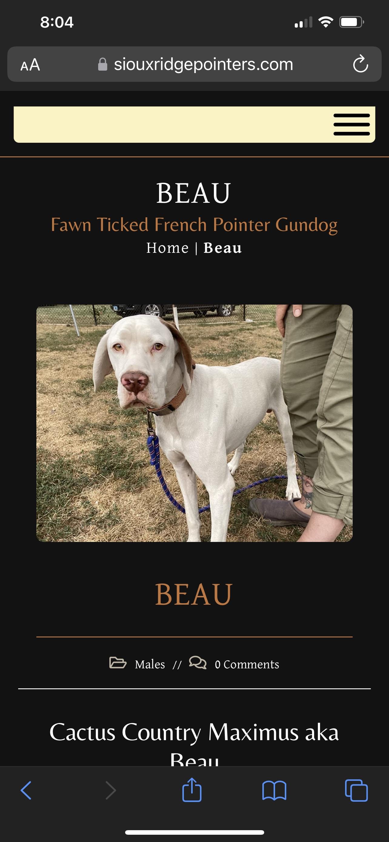 Beau is a male Braque du Bourbonnais. Carefully selected as a great representative of his breed, Amber & Steve decided to make him part of their program. Amber & Steve has passed Good Dog’s screening process, which involved a review of their breeding practices, environment, and the mental and physical health of their dogs.