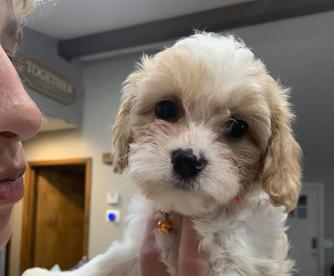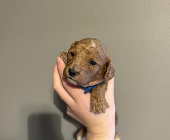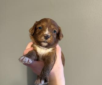 Mae is a cavapoo that we kept from a litter and have raised! She is playful and smart! Great temperament. She is expecting her first litter with her hubby Griff. So these puppies will be F1B red cavapoos!