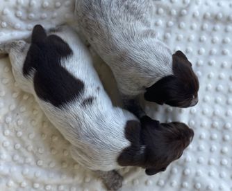 Our German Shorthaired Pointer puppies include liver roan, liver and white, liver, black roan, and black and white. Vizsla puppies include rust, red, and golden. Colors will vary depending on the parent dogs.
