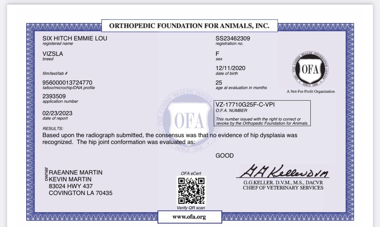 Six Hitch Farm reports to performing the health tests below on their breeding dogs. Ask your breeder about the tests performed on the parents of your litter. Learn more about health testing for German Shorthaired Pointers.