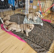 We do a lot of work with our puppies from day 1 of their lives including daily handling and socialization, sound desensitization, socialization with our other dogs, lots of people and car rides, and we start introducing them to the crate around 6 weeks old in hopes we get a good couple weeks of training them in the crate. We use pellet boxes to litter train them as well starting early (around 3 weeks). We try to temperament test each litter at 7 weeks of age so we can provide info on each of their specific energy levels.