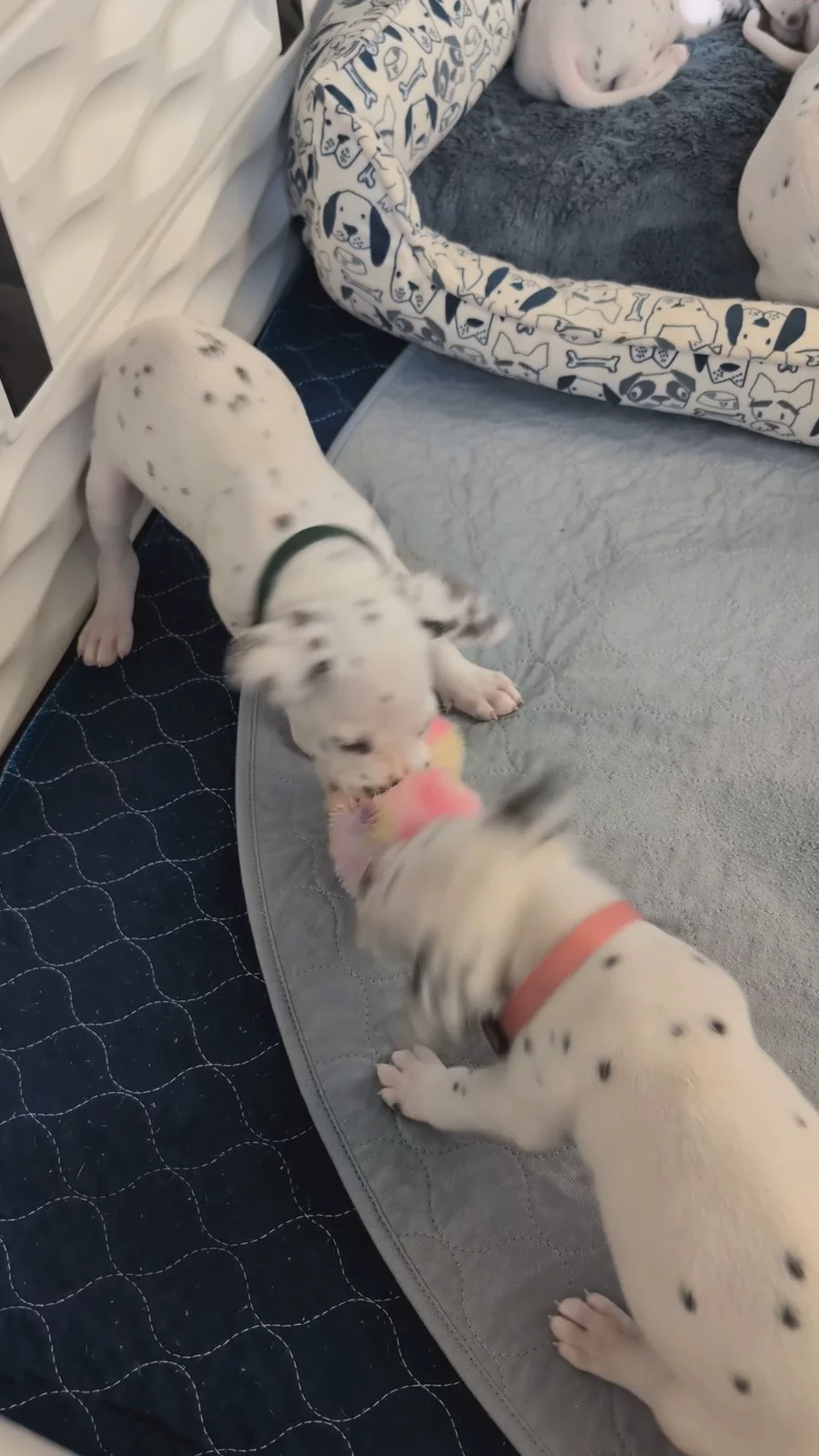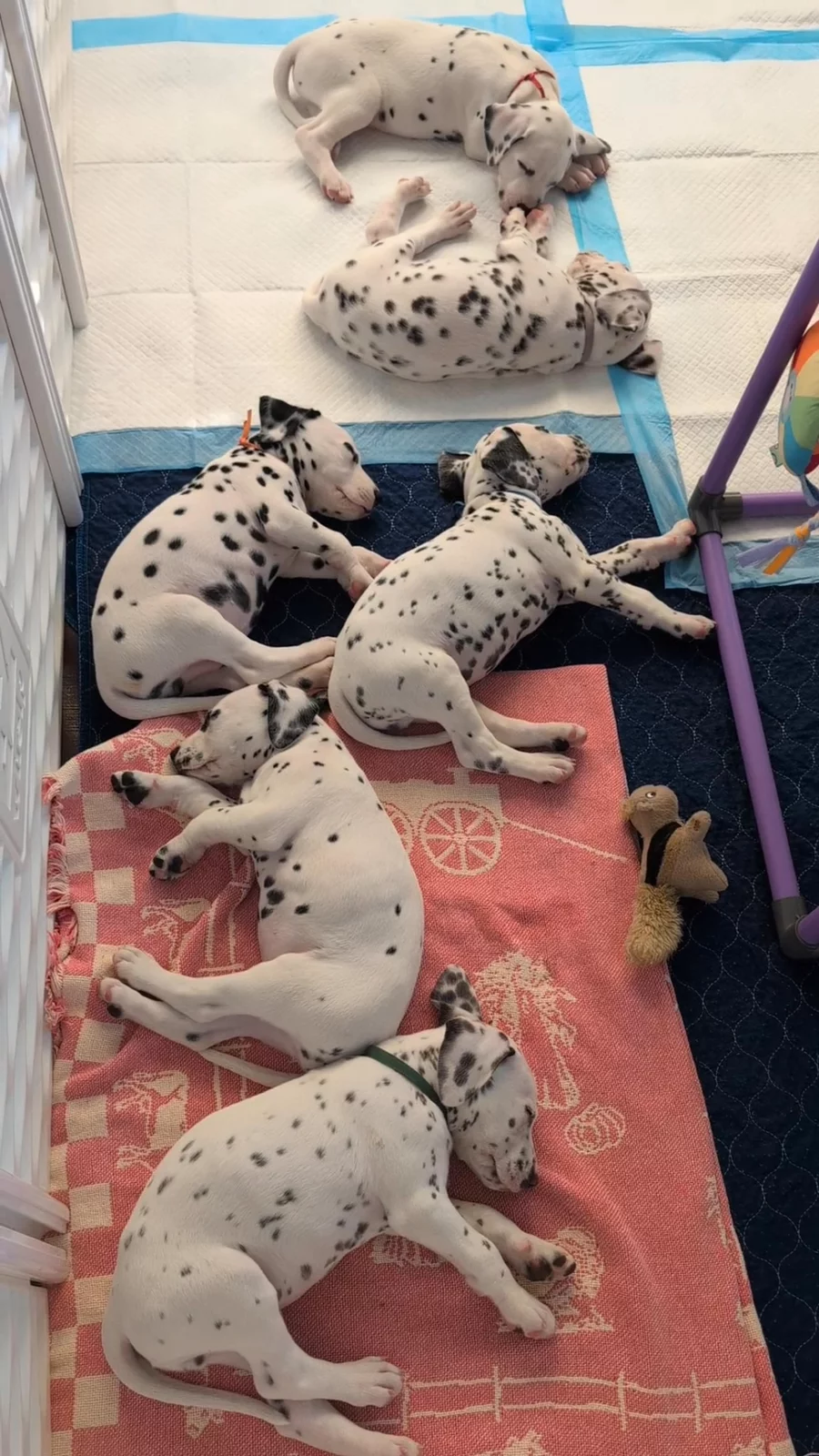 Good morning from these chunky spotted scoops of love!! Fast asleep after their morning playtime in the backyard. Go home day is only 1.5 weeks away, time has flown by 🥹