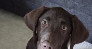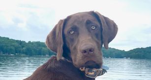 Very refined dark chocolate female with laid-back, patient demeanor. Friendly with everyone, she has kind eyes and is a companion dog who loves to spend time swimming at the river and riding on boats.