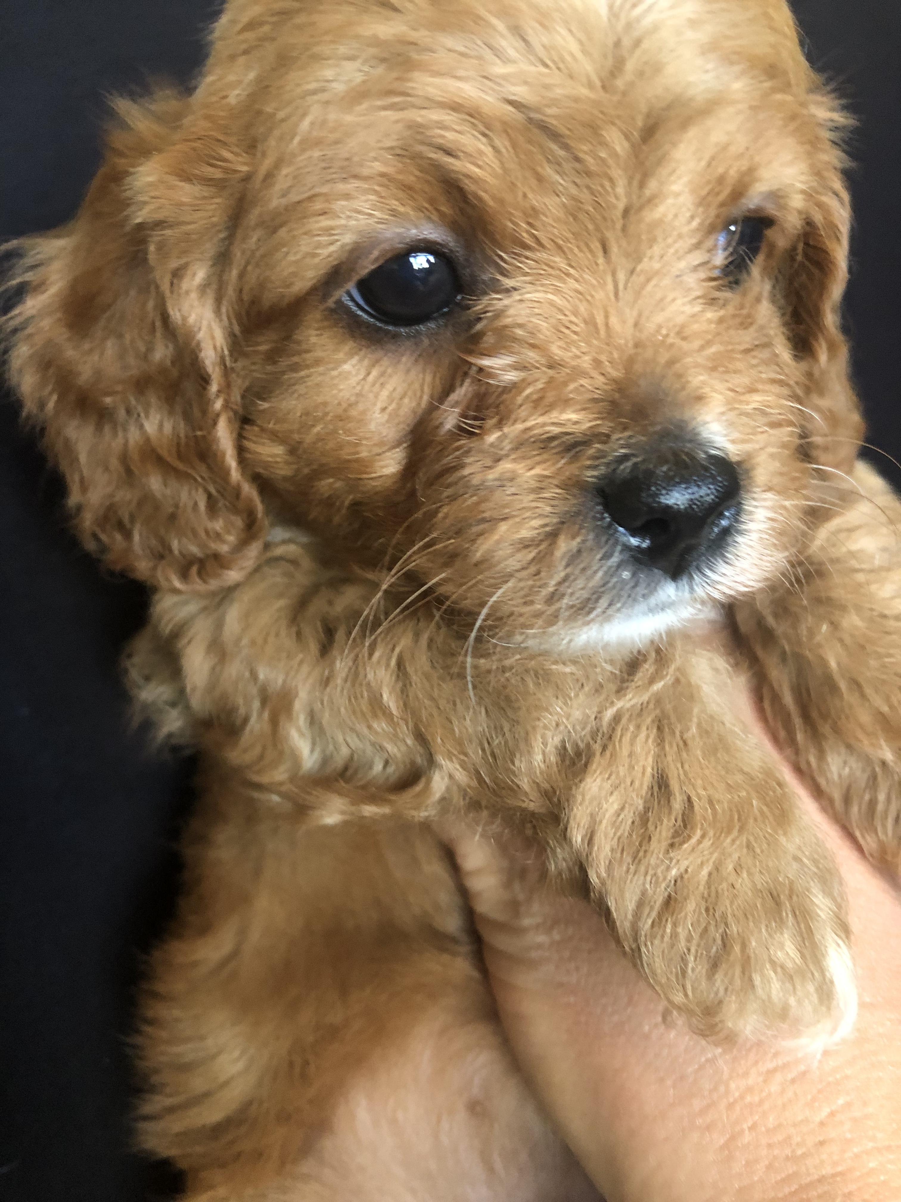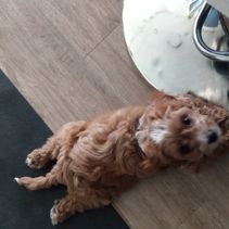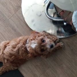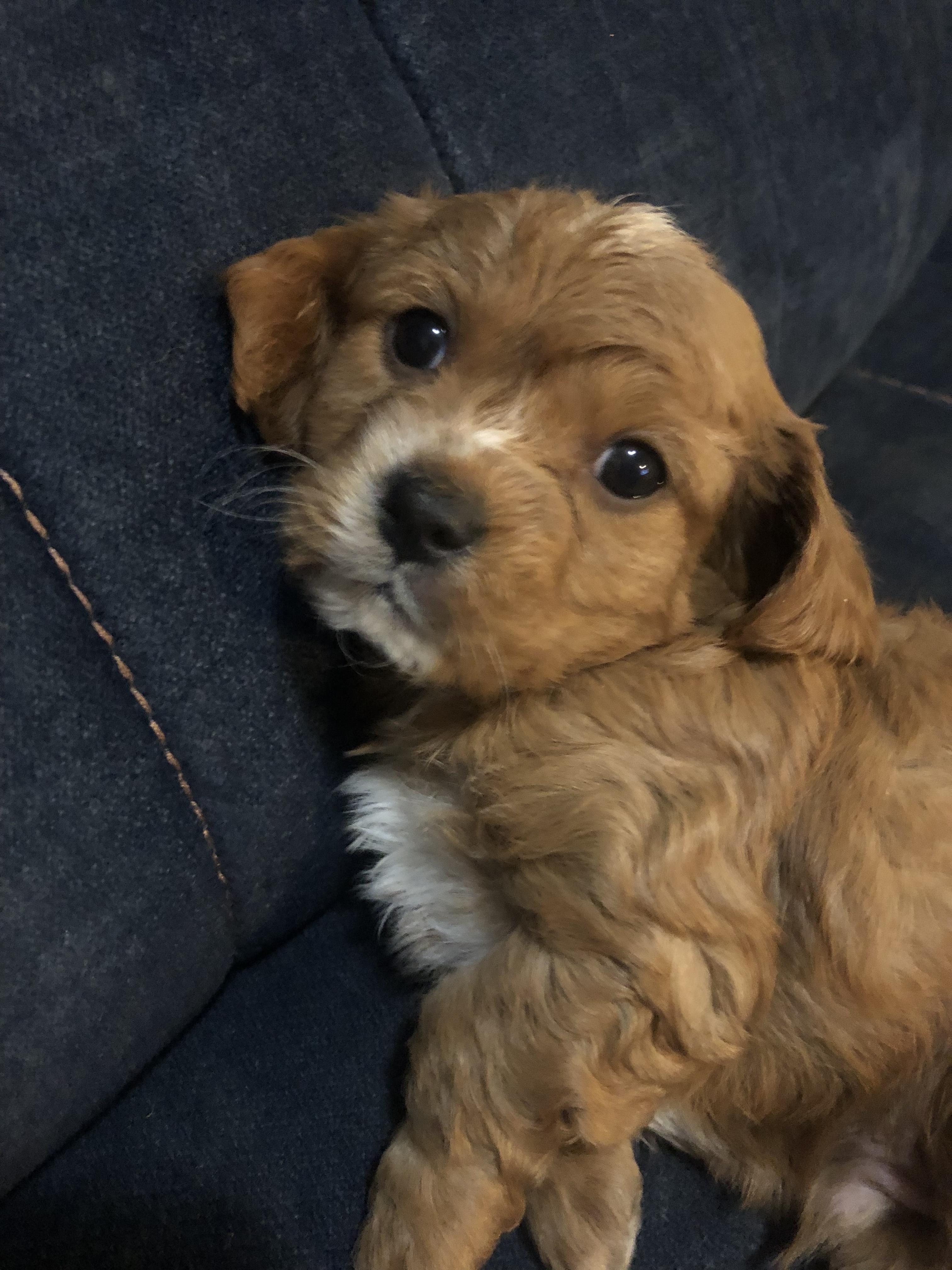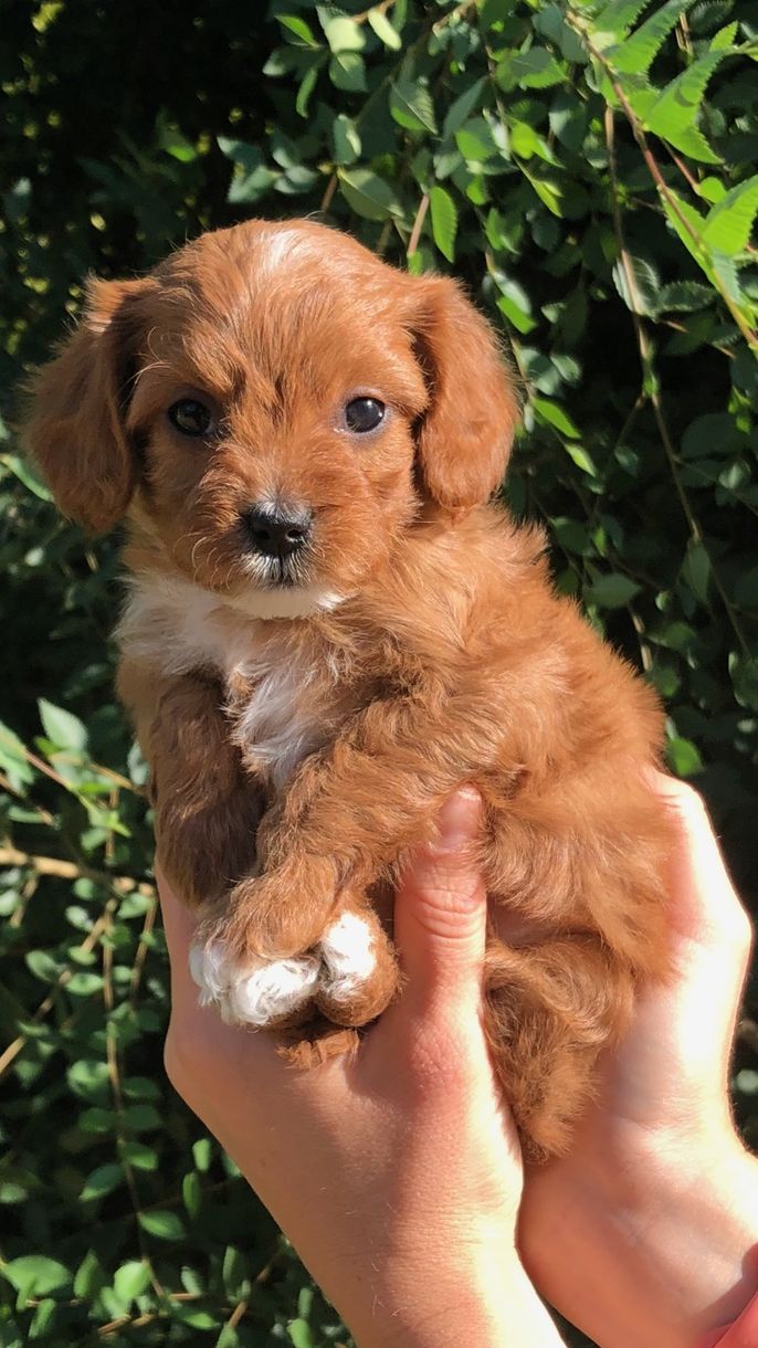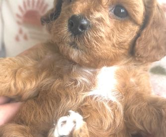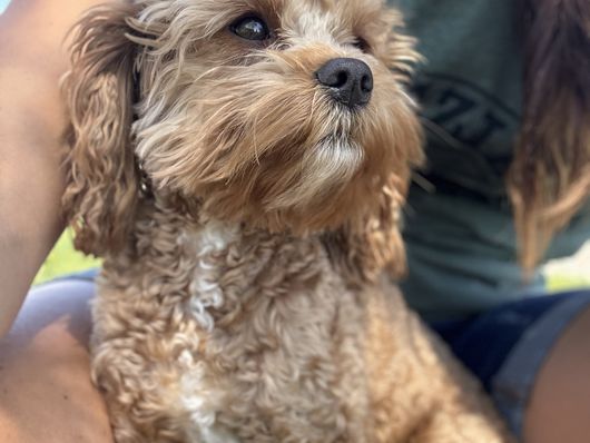 Layla is the sweetest, most loving dog ever! She loves my four kids with her whole heart and is ALWAYS following one of them around. She loves running and playing on our small farm, but her favorite spot is curled up by me while I read. She is red with a white chest and paw. She is a tiny F1 cavapoo, weighing just 9 pounds.