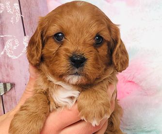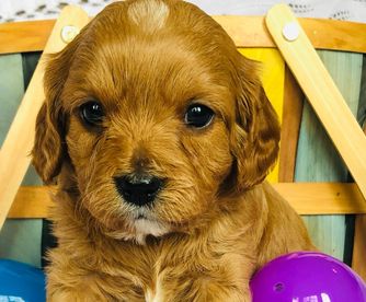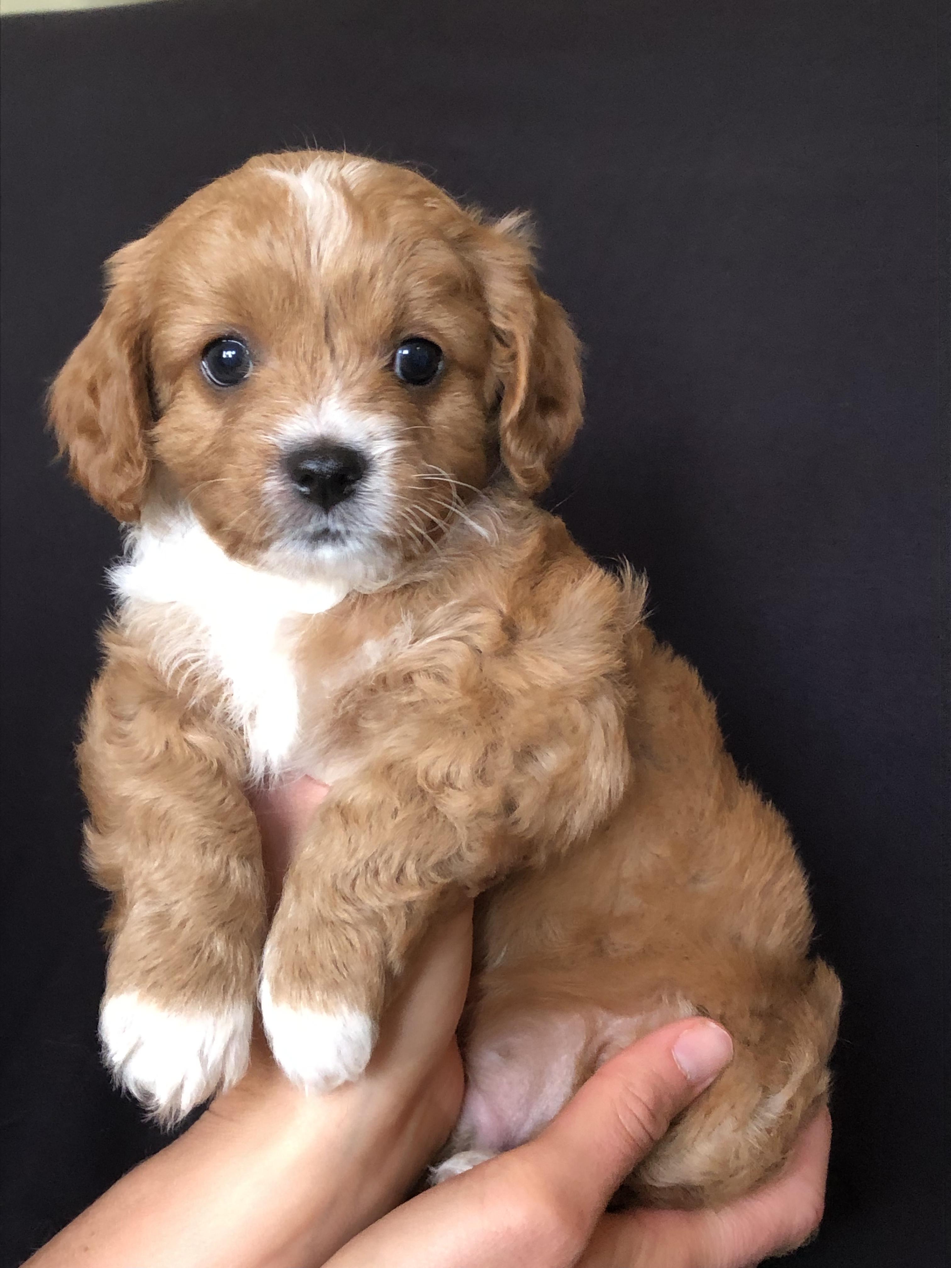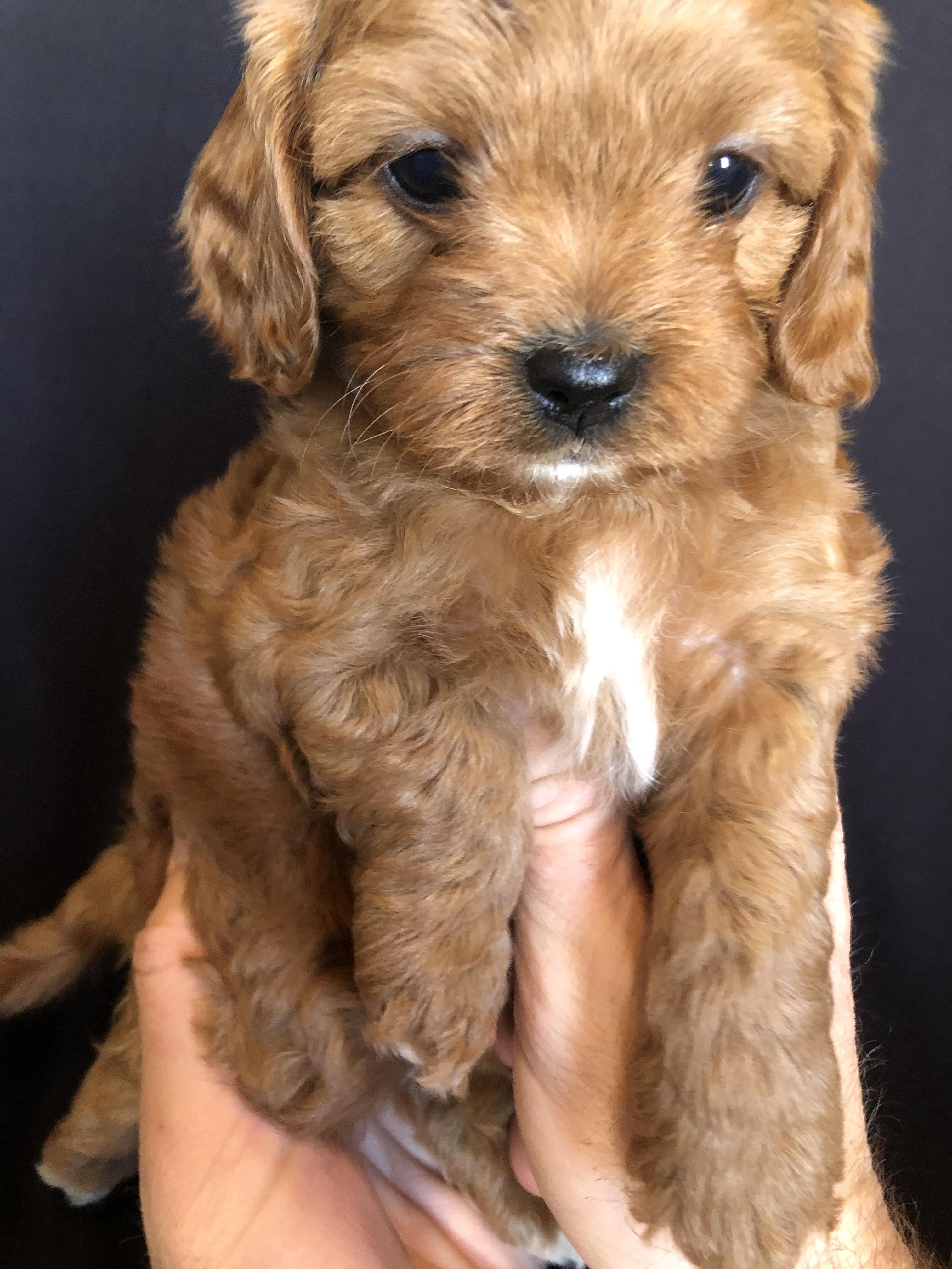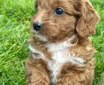 Layla is the sweetest, most loving dog ever! She loves my four kids with her whole heart and is ALWAYS following one of them around. She loves running and playing on our small farm, but her favorite spot is curled up by me while I read. She is red with a white chest and paw. She is a tiny F1 cavapoo, weighing just 9 pounds.