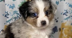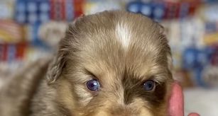 Blue merle female 6 lbs and 9” she has 1 blue eye and 1 brown eye. She is very people friendly loves everybody. Panel clear.