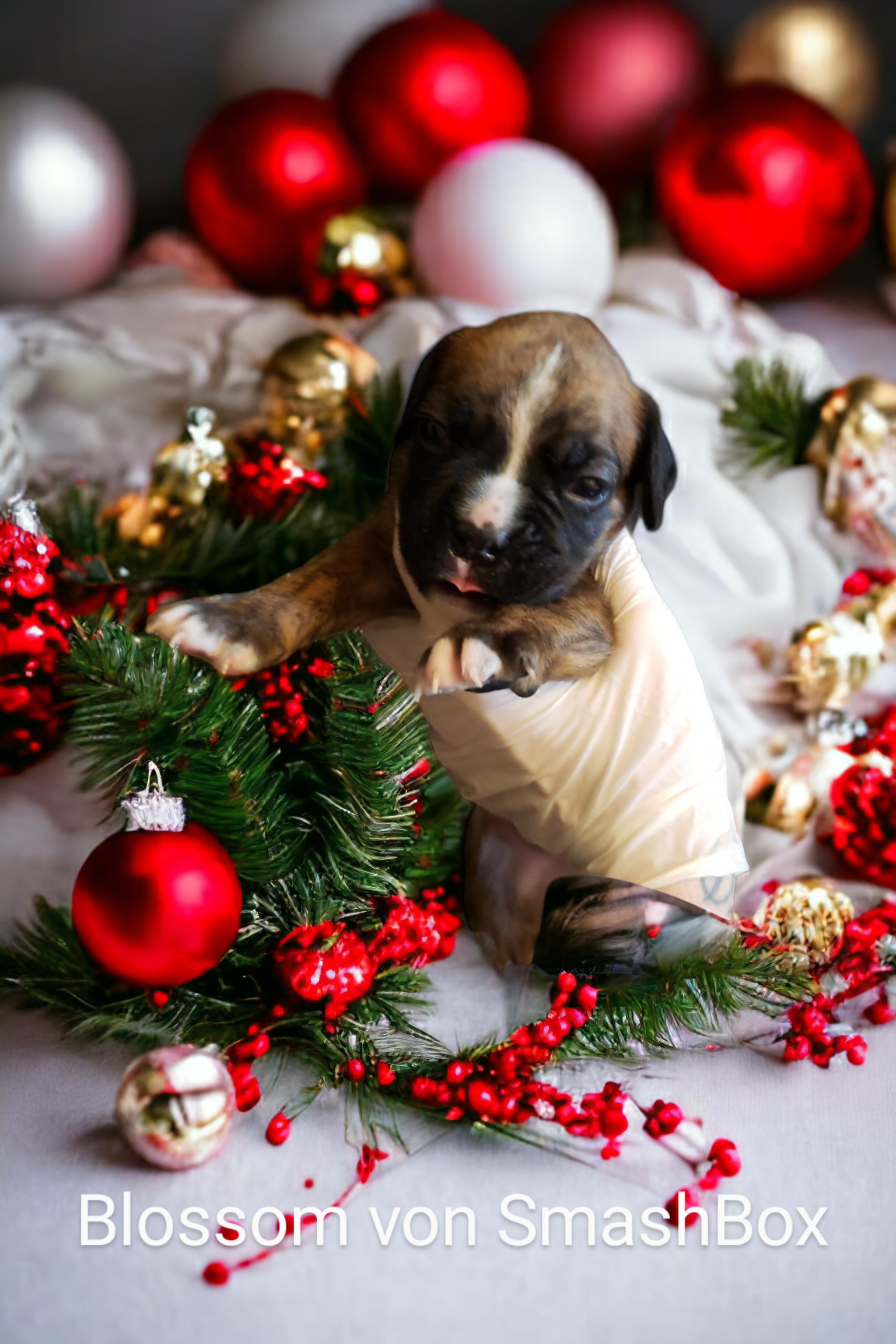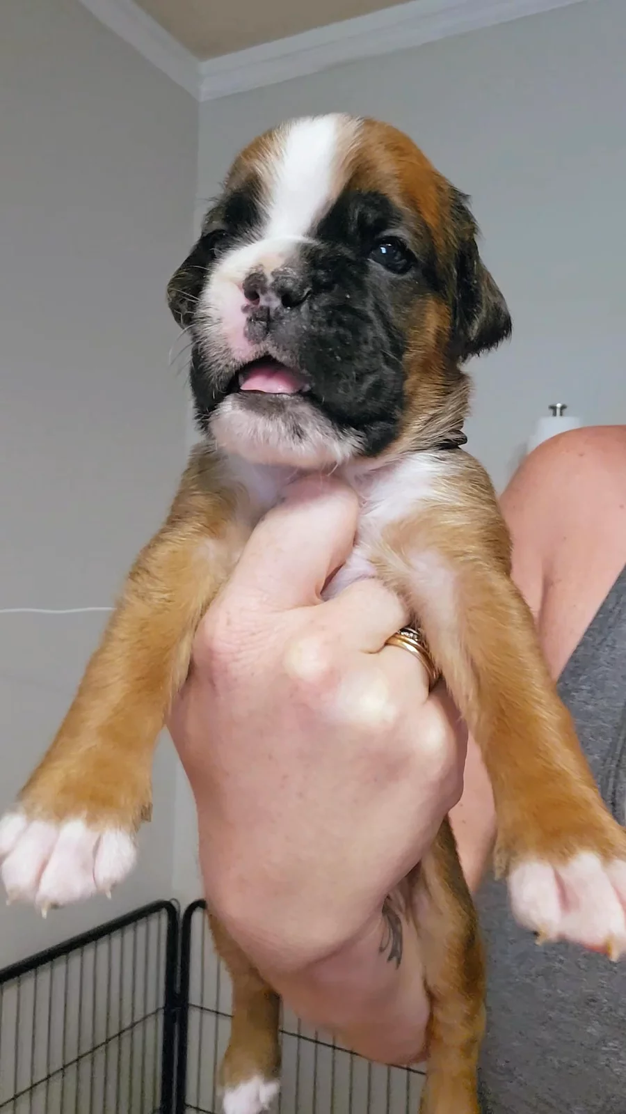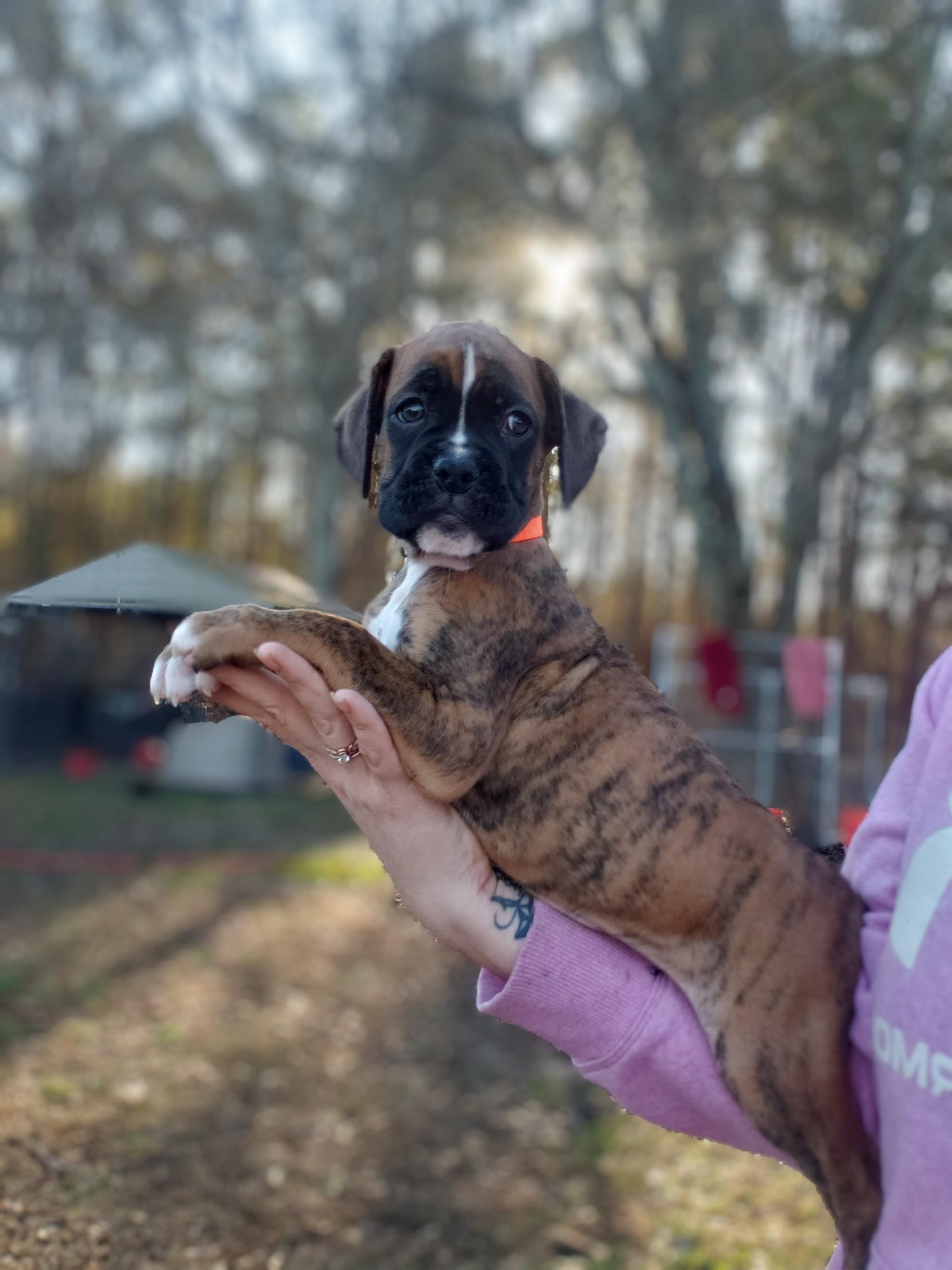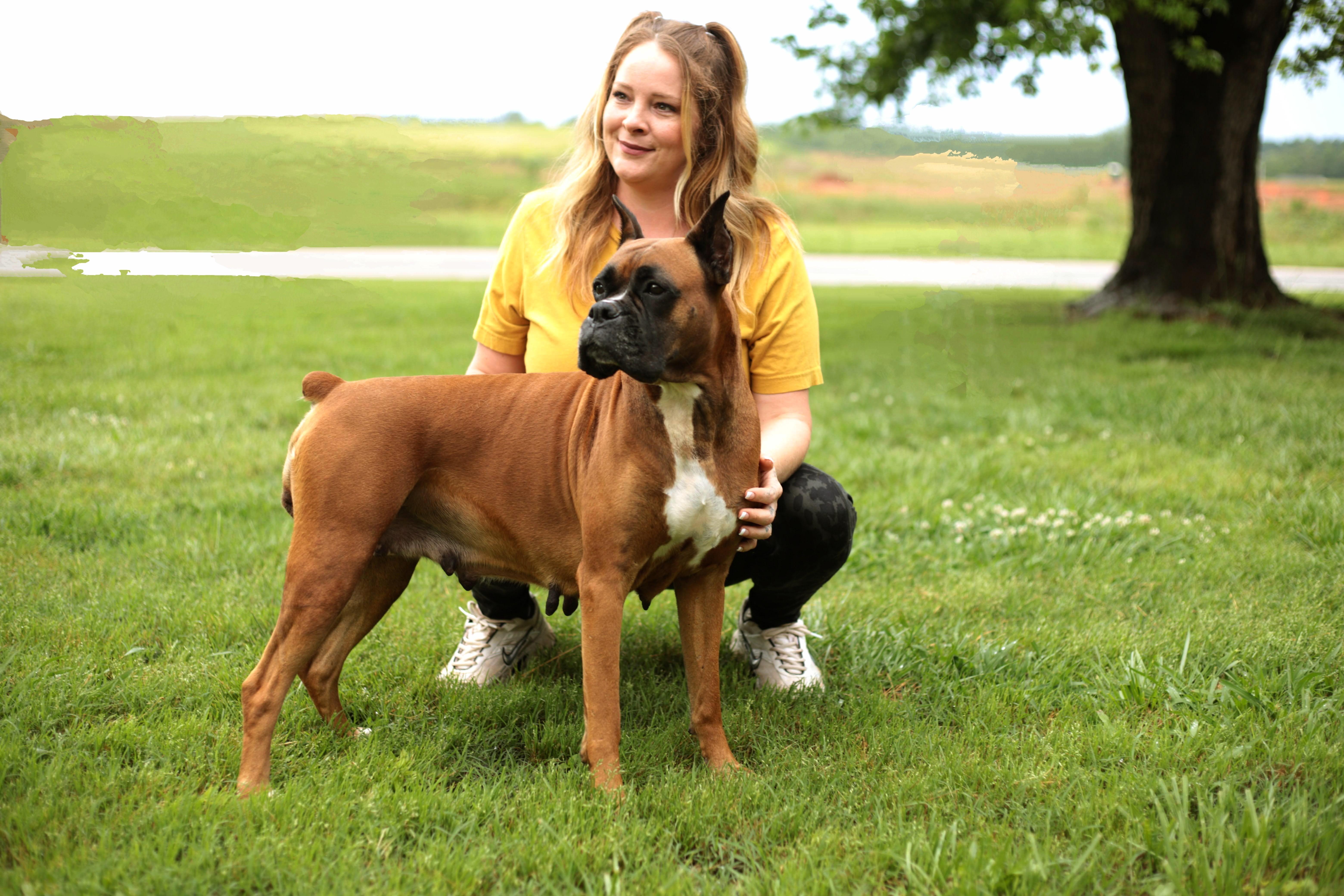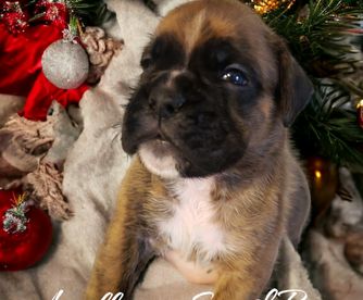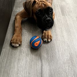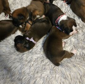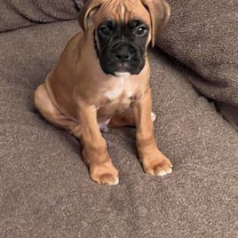 Tarah was so friendly and knowledgeable about the boxer breed! I have owned/raised boxers my whole life so as far as the breed I was already sold, but it’s so important to know the breeder is trust worthy and just a good person. Tarah is very energetic and enthusiastic about the breed. She was sweet and kind to all the puppies and adult dogs in her care. I know that may sound silly but to me it’s important to know the background of the person who made first contact with your puppy. She is organized and clear with instructions on signing the contract, payments, how to register with AKC and upcoming vet visits. Our sweet Ellie-May became a part of our family November 9th and she’s been nothing but laughs. She’s highly intelligent. She picked up potty training with the use of a bell on the door within about 5 days with only a few accidents inside when we didn’t get to the door quick enough. She understands basics commands sit, stay, here, fetch & wait. We make her wait and sit at the food bowl until we say “nose goes” and touch her nose, then she eats. Genetically she’s very healthy vet said she’s going to be a big girl probably around 70 lbs. She’s 6 months and weighs 50lbs. She is absolutely beautiful! We couldn’t be happier about choosing Tarah and VonSmashbox boxers!