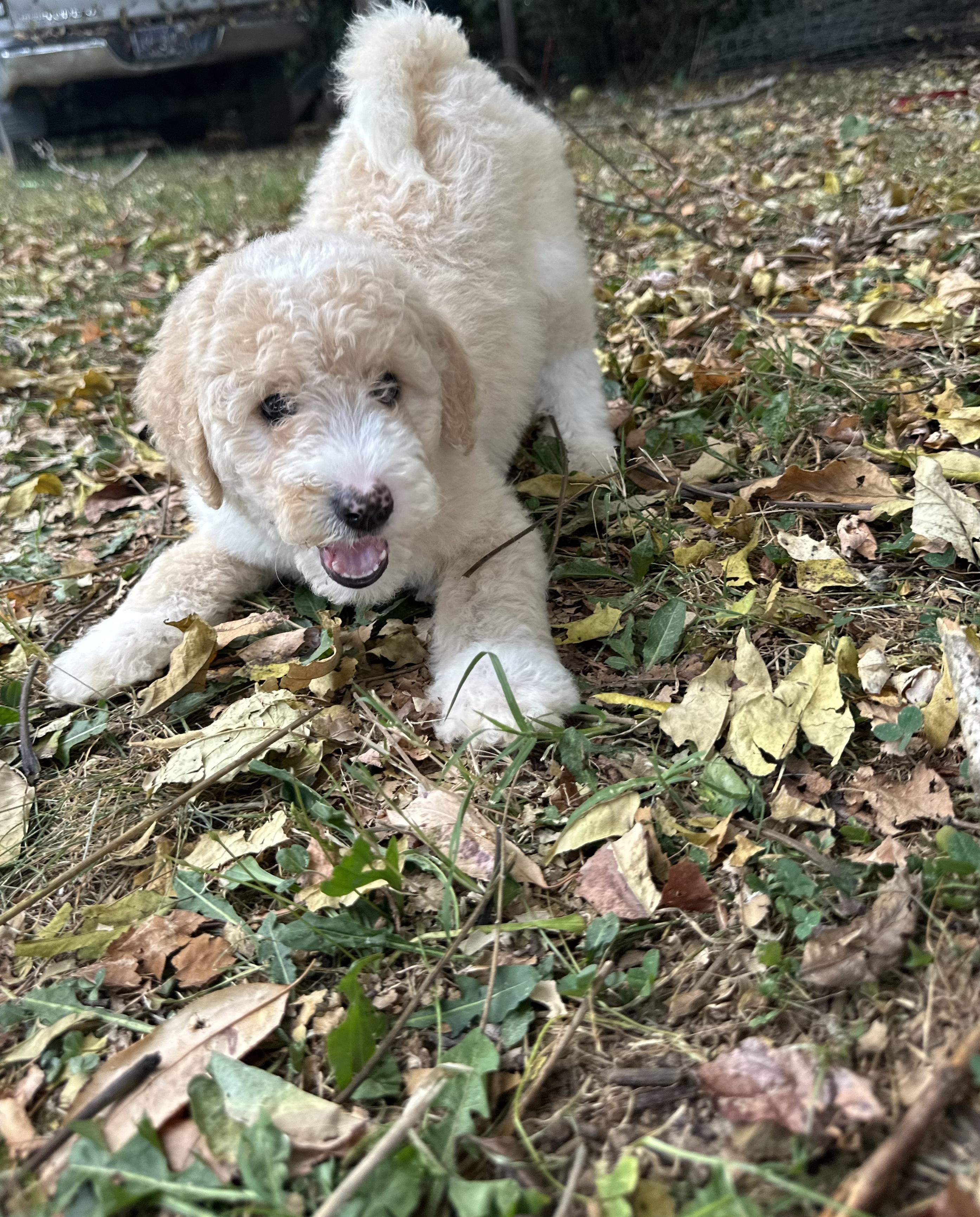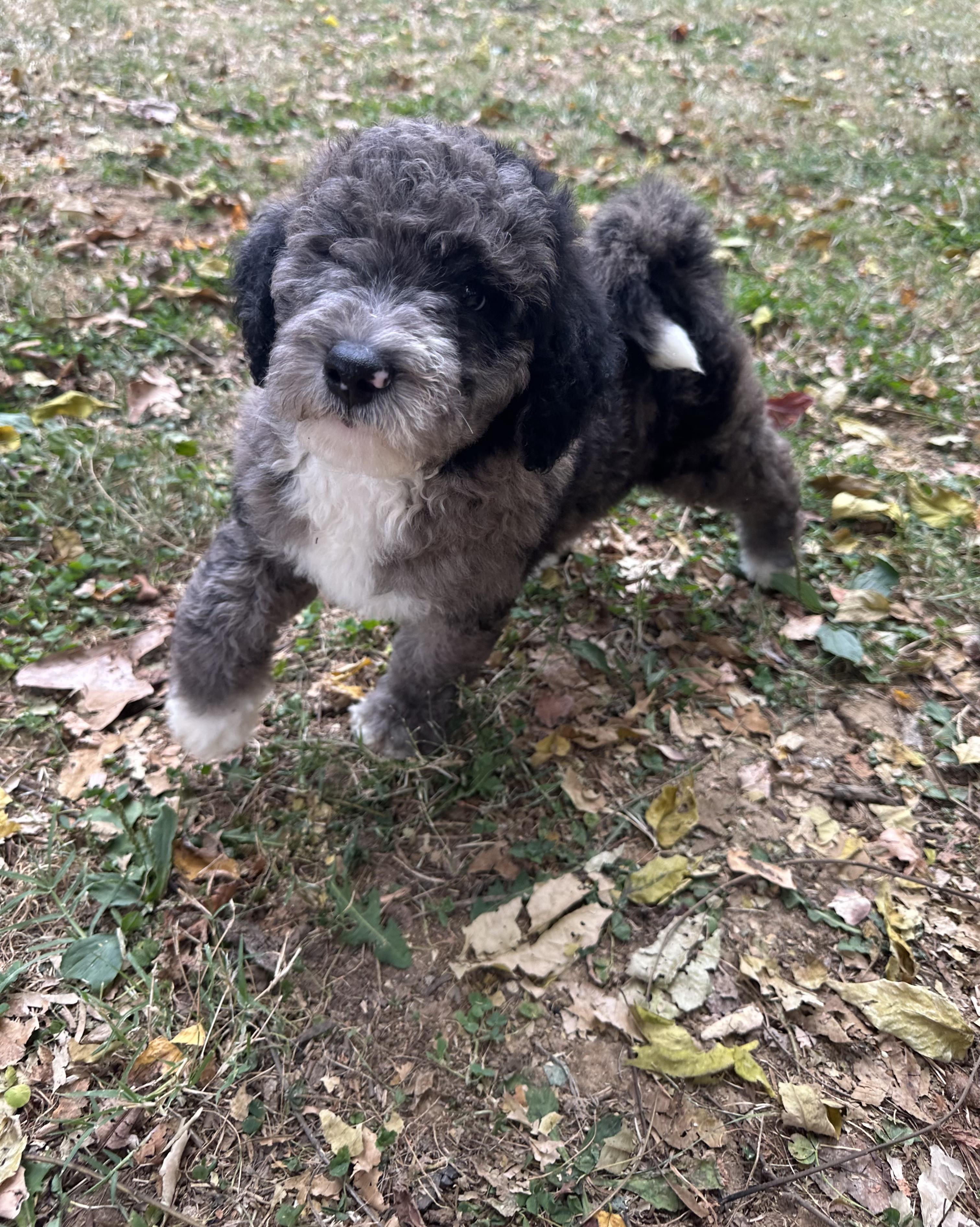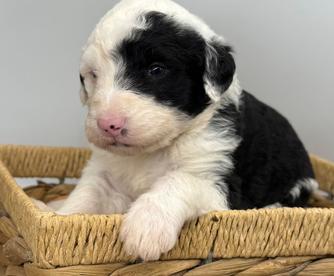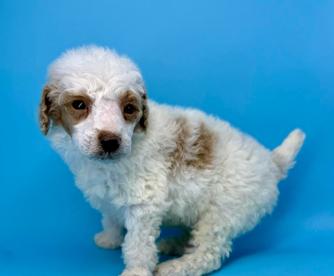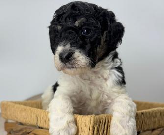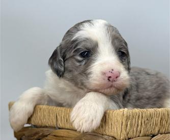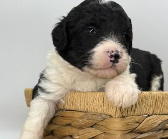 Our Poodle puppies include sable, apricot, black, brown, cream, parti, and phantom. Sheepadoodle puppies include merle, white, blue merle, blue gray and white, black and white, and black. Colors will vary depending on the parent dogs.