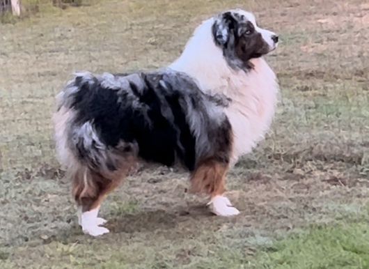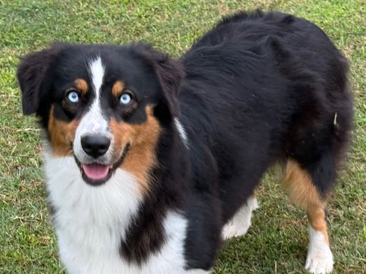 Lyric is a Black Tri female with blue eyes. She is AKC/ASCA registered. She has a exceptional personality that is affectionate, social and biddable. She loves people and her smooreaussie pack. She loves playing in the water.