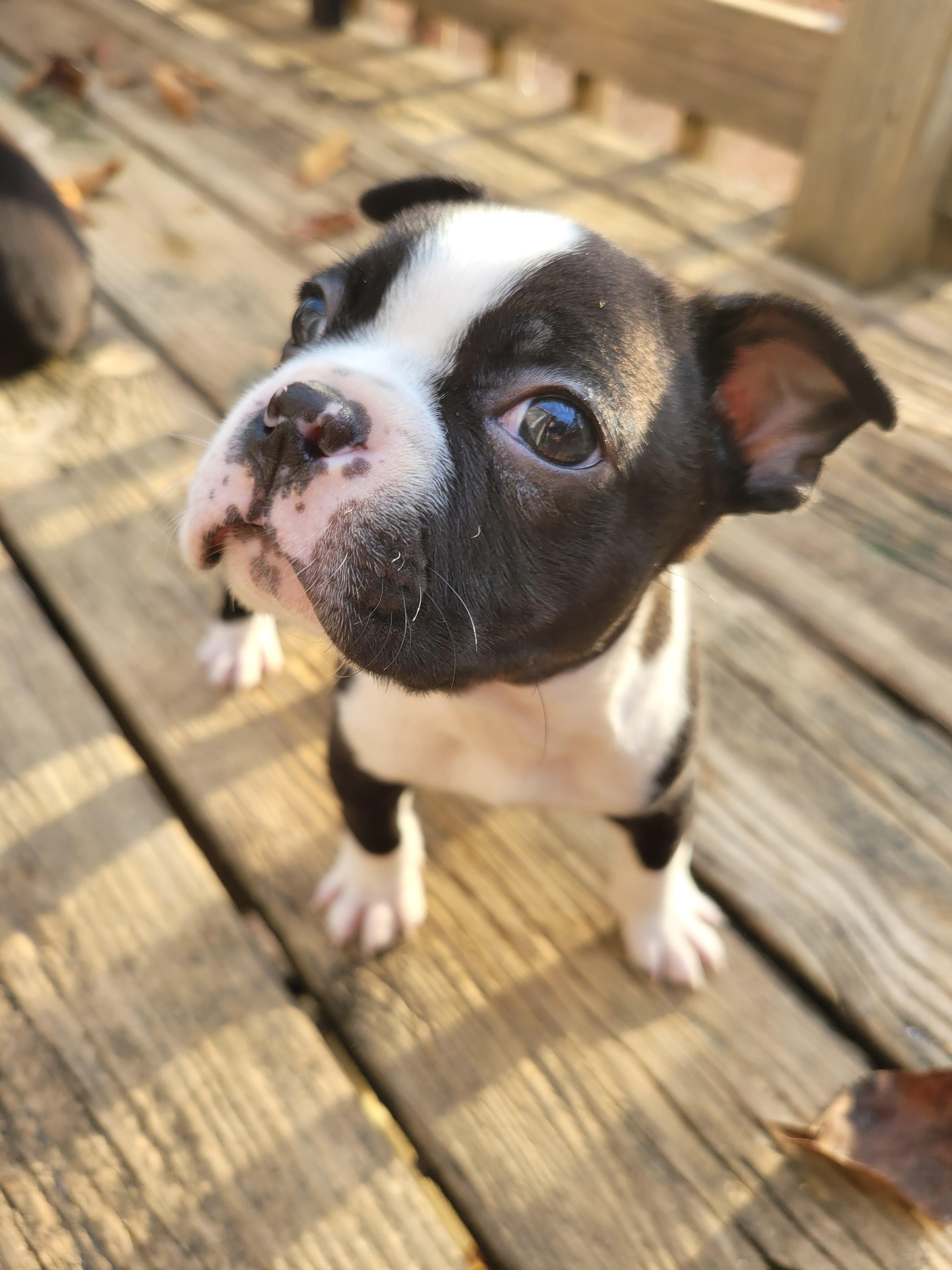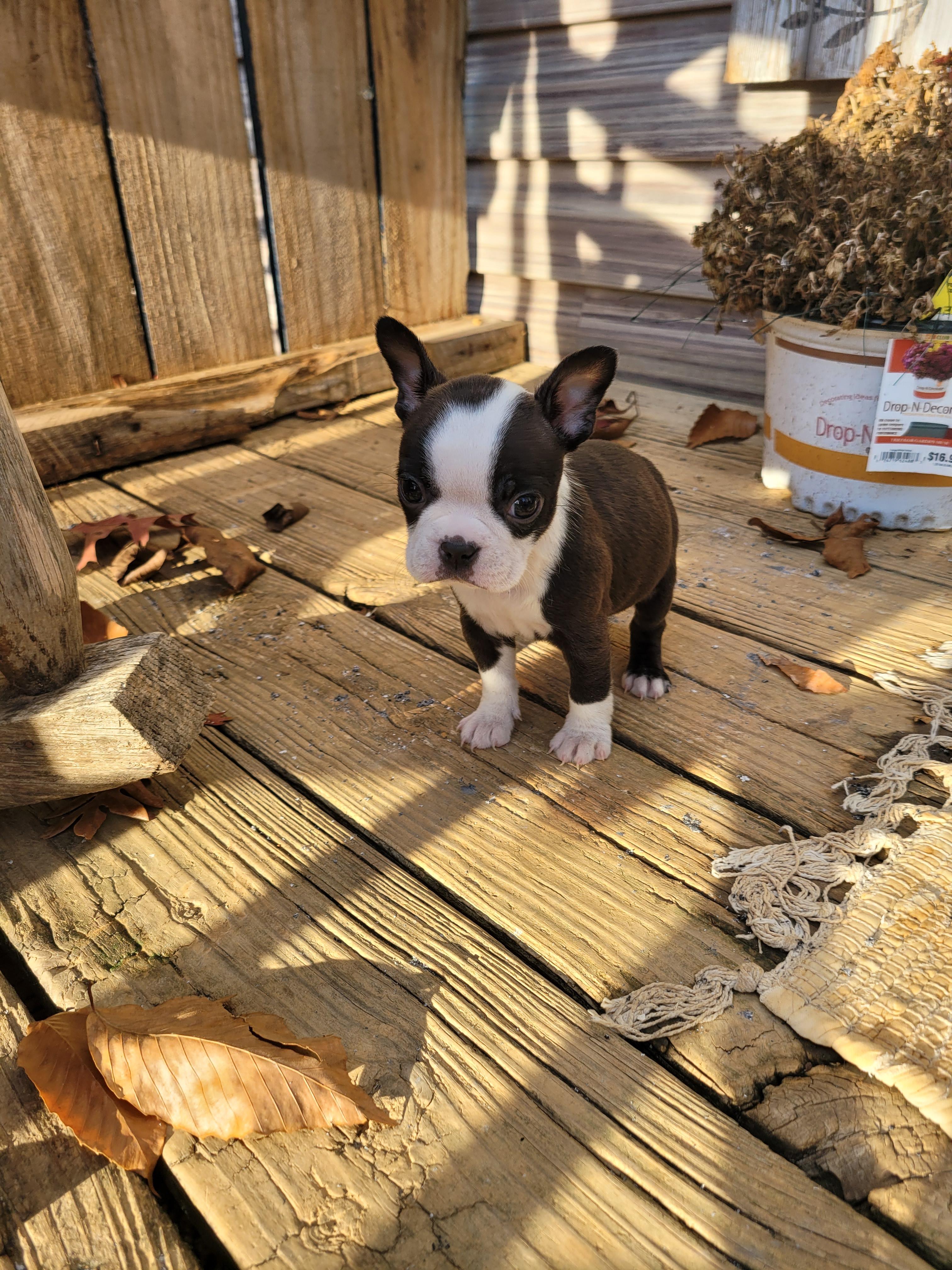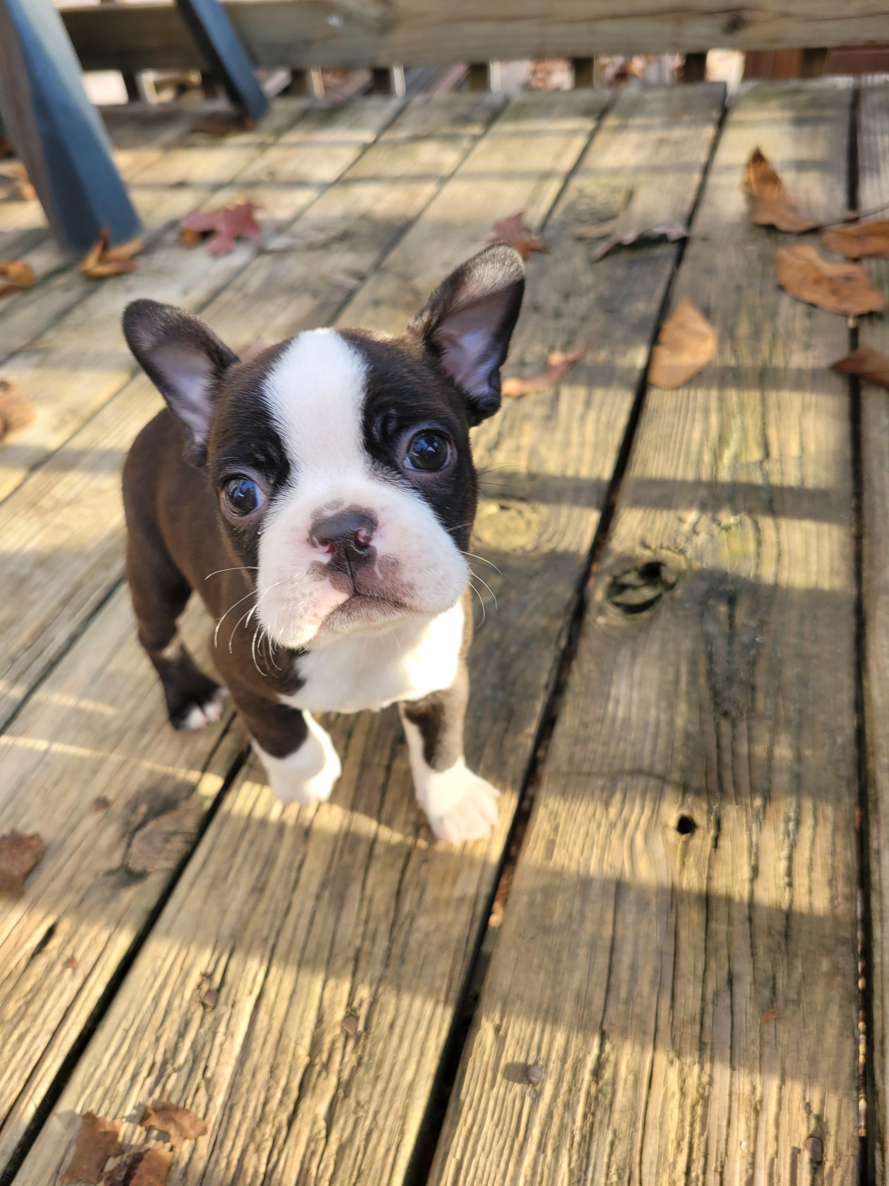 He is champagne in color. He is on the bigger end of Boston Terriers. He is the most laid back boy we've got. He is always happy, at times energetic and it always looks like he is smiling. He loves to be talked to, he turns his head sideways when he's being talked to like he knows exactly what you're saying to him. He isn't much of a barker but does make some whining noises at times. He gets along great with other animals as well. Anything else you want to know feel free to reach out and ask us.