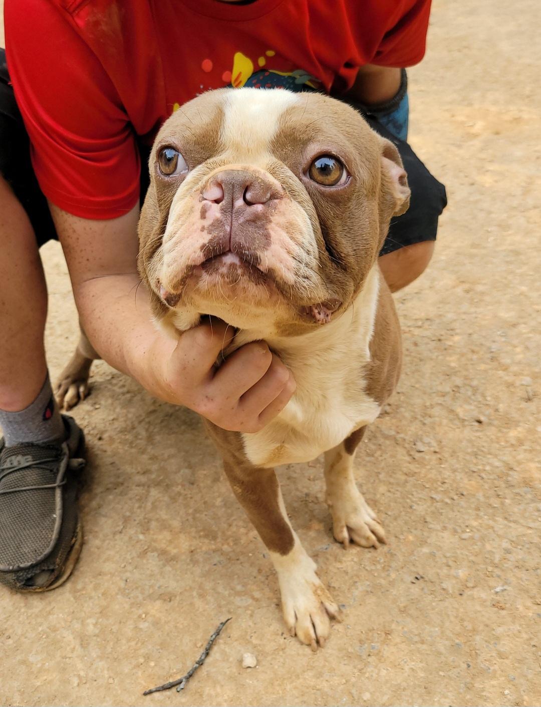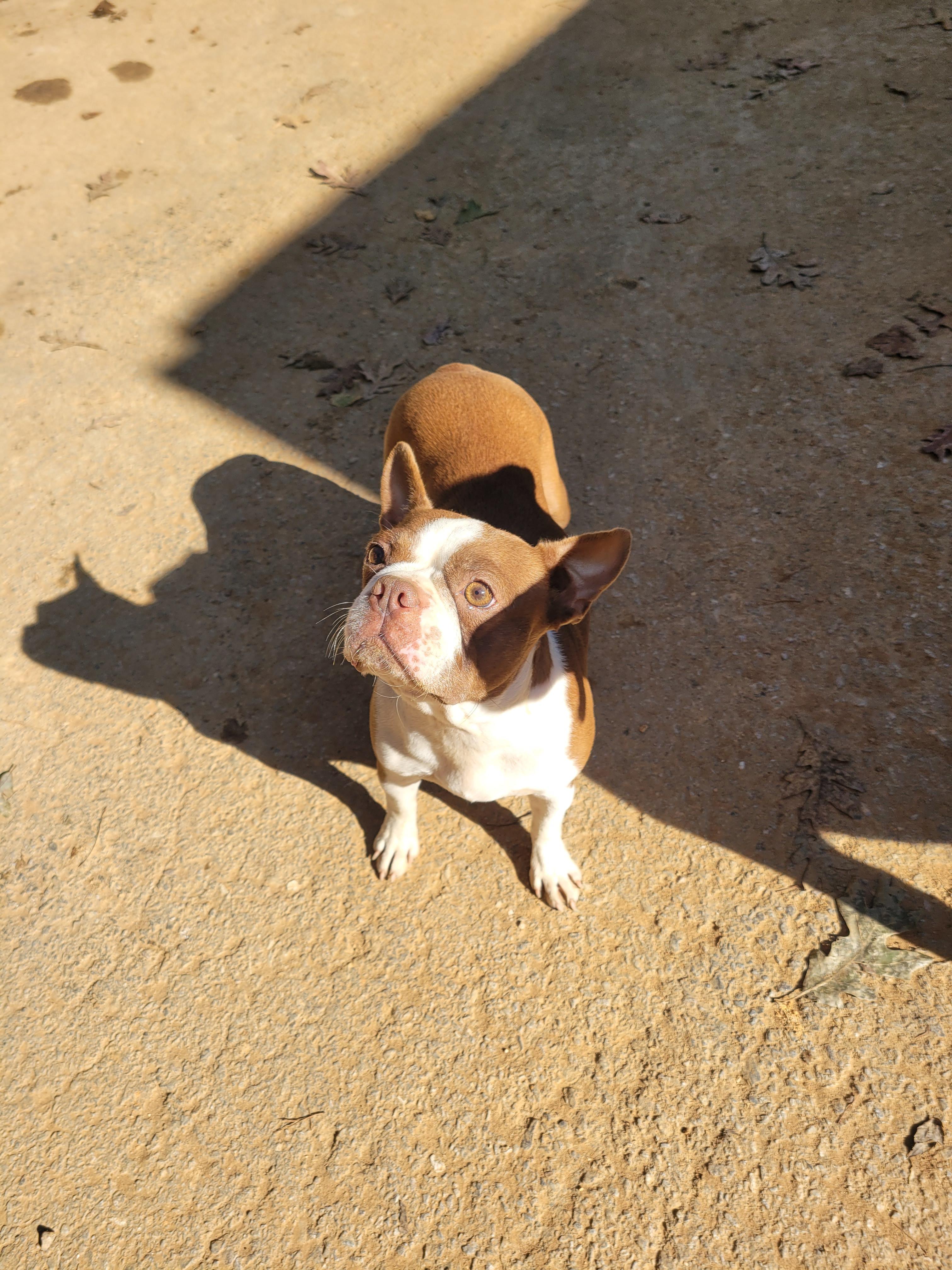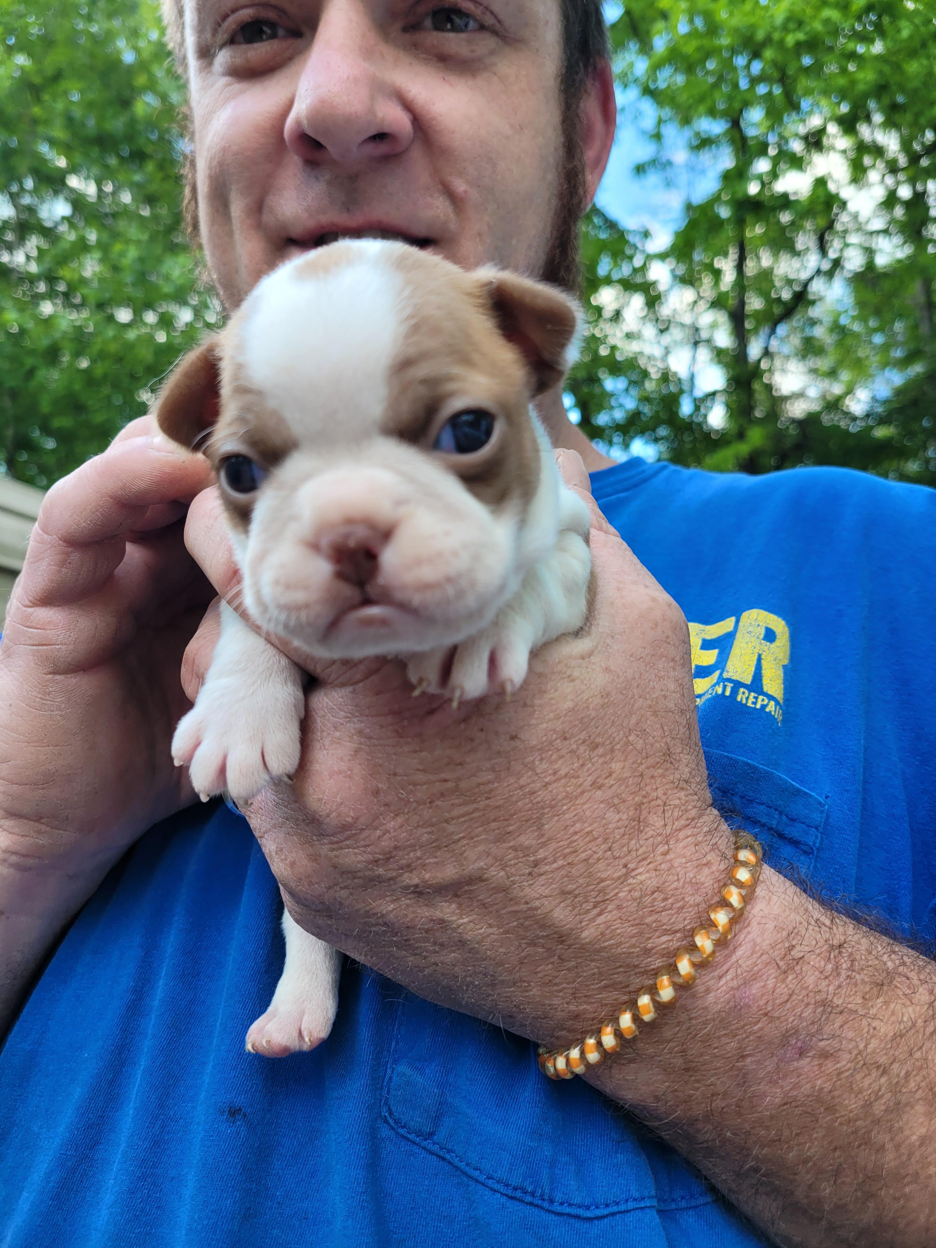 He is champagne in color. He is on the bigger end of Boston Terriers. He is the most laid back boy we've got. He is always happy, at times energetic and it always looks like he is smiling. He loves to be talked to, he turns his head sideways when he's being talked to like he knows exactly what you're saying to him. He isn't much of a barker but does make some whining noises at times. He gets along great with other animals as well. Anything else you want to know feel free to reach out and ask us.