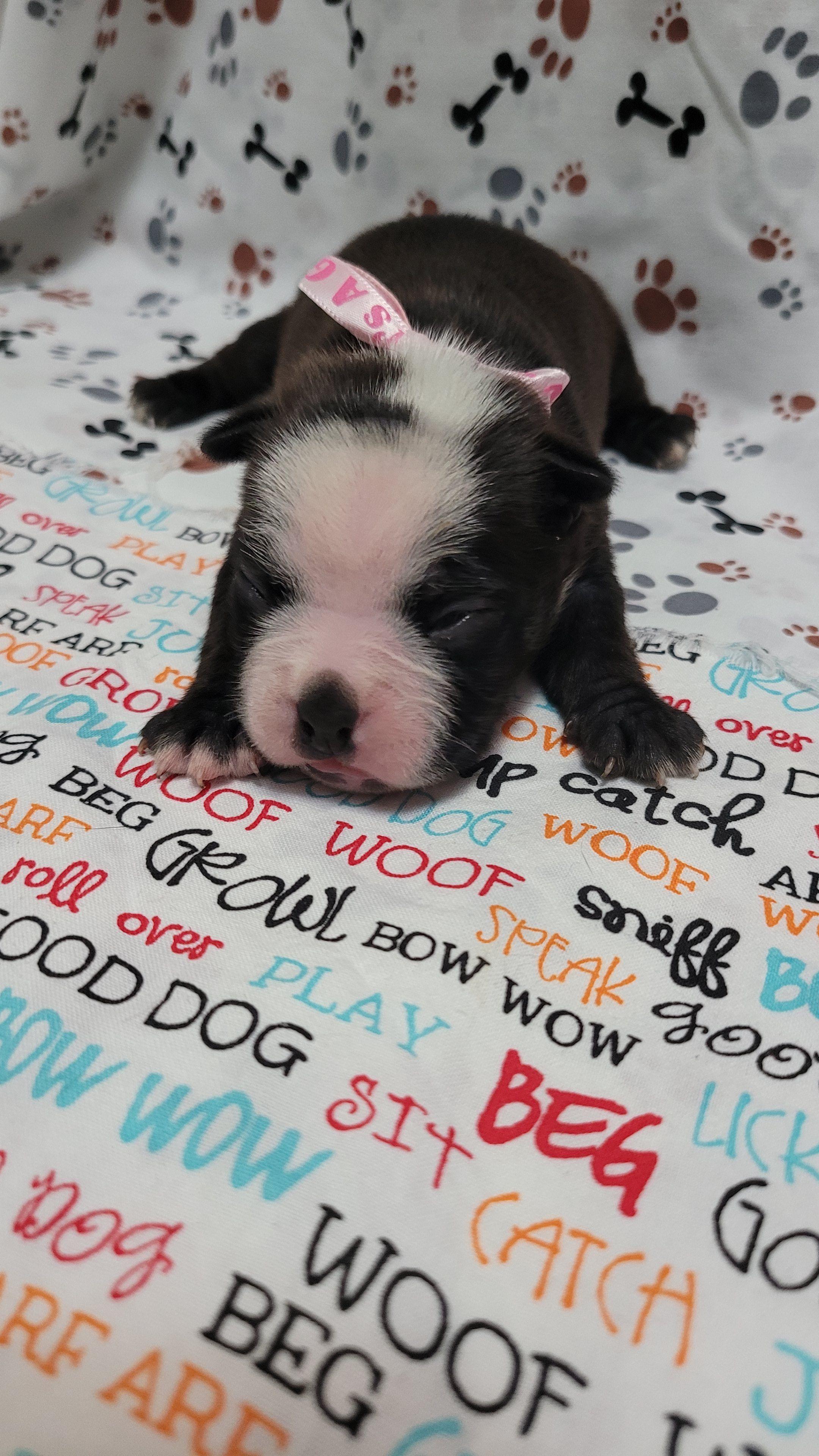 We had bostons as our pets before we got into breeding. Well it actually just happened. Our Bostons Lola and Tripp accidently hooked up and before we knew it we had 3 gorgeous baby bostons. We loved playing, cuddling, training and all the stuff that came with raising puppies. Shortly after rehoming our last puppy we came across an opportunity to save a few Bostons from the life they were living. They came pregnant and that's when we decided to make it a business and breed and sell Boston Terriers.