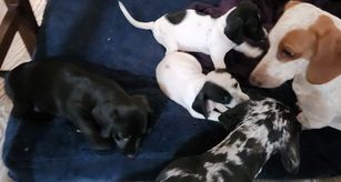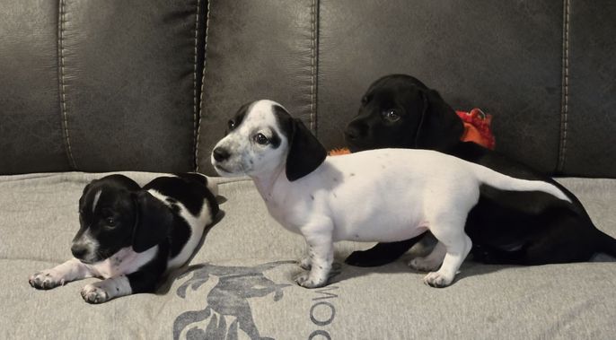 Our puppies include piebald, black, and black and tan. Colors will vary depending on the parent dogs.
