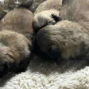 Our Pekingese puppies include gray sable, light red, black, black and tan, cream, fawn, fawn sable, red, and white. Pomeranian puppies include red and black. Colors will vary depending on the parent dogs.