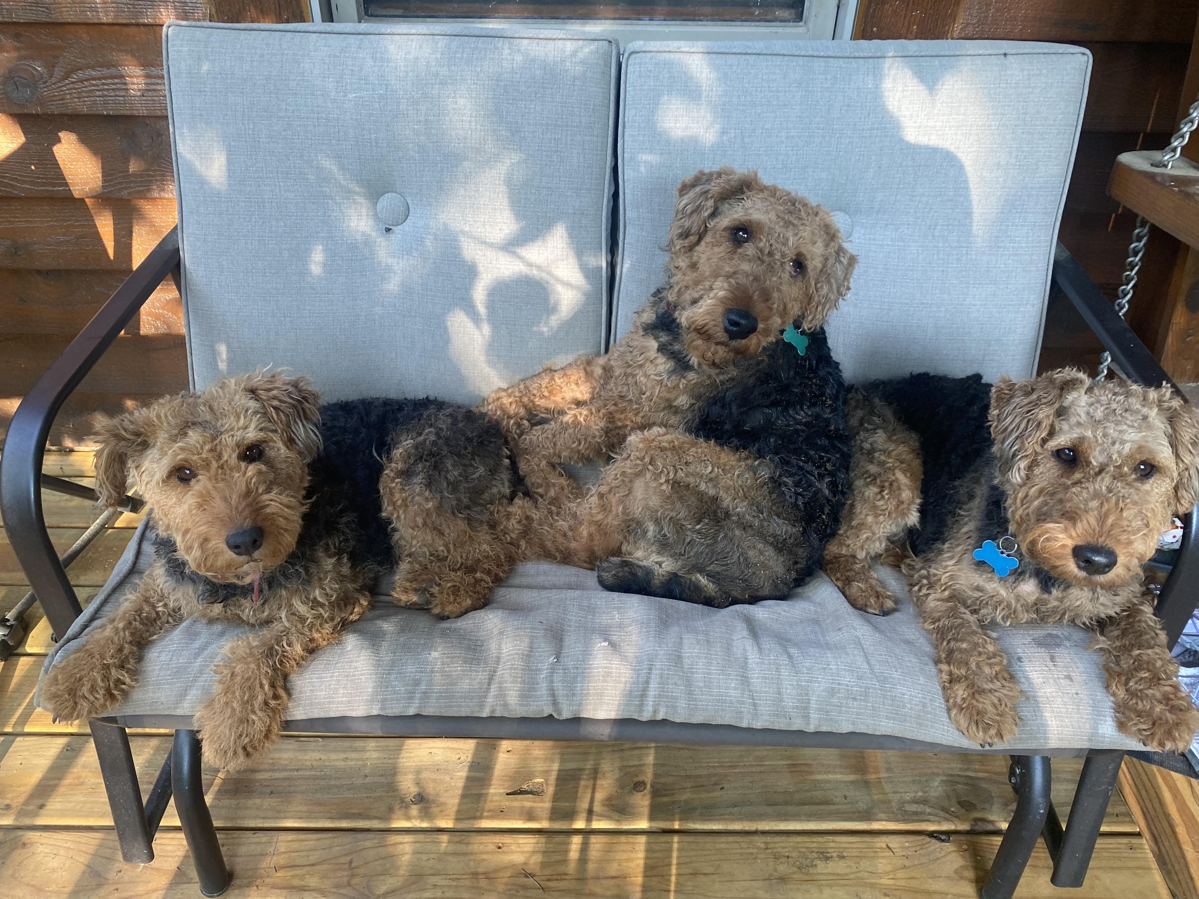 I love these intelligent, affectionate, hardy, sturdy beings. Welshie are hypo-allergenic, and have no known genetic health conditions. My dogs are healthy and strong and can walk for 1 mile or 20 miles. They love to snuggle on the couch or anywhere else you will let them and in my opinion are the perfect size, reaching 22-25 lb as adults. They are true terriers - they have their own mind – that independent, stubborn streak that makes them adorable and maddening at the same time. I’ve had many adventures with my crew over the years - Corky “disappearing” on the trail – only for me to find our hours later he had found a couple of teenage kayakers and had gone on a kayak ride with them! Lola, fixated on flying squirrels, sitting under the pine trees in Northern Wisconsin, every inch of her body quivering, even in sub zero temperatures, and Didi, Snow Dragon Snake Girl, who has hunted every creature from frogs, to turtles, to ducks, to a 400 lb bear. Welsh Terriers are definitely not your average dog!