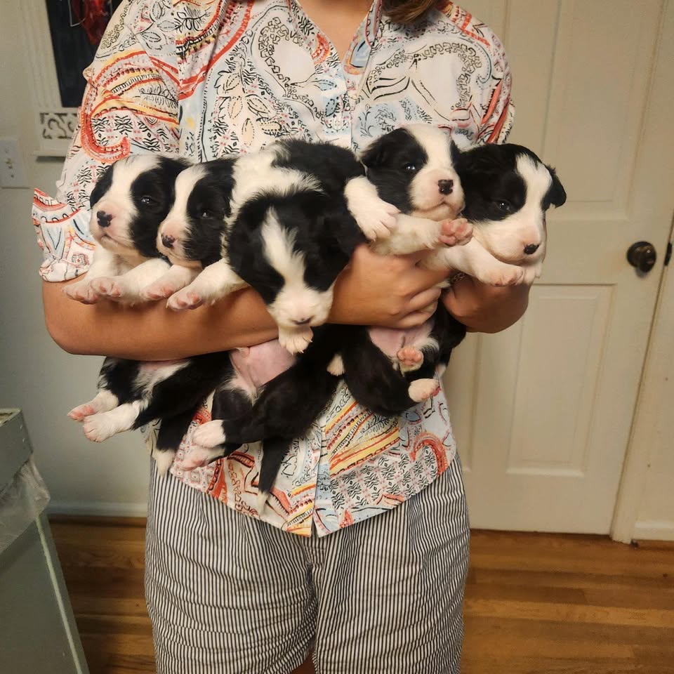 I'm Melanie A., the breeder behind Snowbird Border Collies located in Powder Springs, GA. Our family of 11 children (and 22 grandchildren) has been carefully breeding high quality puppies for 30 years. Generational OFA certifications and Generational AKC Champions mark our lines. Of primary importance are the dispositions of the parents we breed and the socialization of their puppies. We, and all the grandchildren when about, handle our pups every day, interacting, playing and turning them upside down, touching their paws, teaching them to look at us and engage. We take every opportunity to help our pups connect with humans. We offer a health guarantee and contract and enjoy making new friends with those who get our puppies. Just this week, a friend who homed 2 of our puppies 14 and 15 years ago, returned to visit this litter as her puppies had passed after a long and happy life. Located in West Cobb County we have a beautiful property with kids, chickens, and our 2 dogs living the life. Our first border collies were Dixie and Spot, who had a fantastic run of 16 years and we still miss them decades later. Our homeschooled children learned responsibility and entrepreneurship from the lessons taught by our precious and well cared for dogs. Give us a call and schedule an appointment to see these exceptional creatures and meet the fam! We encourage families to do their research as a Border Collie is an amazing breed with high intelligence, athleticism and energy.