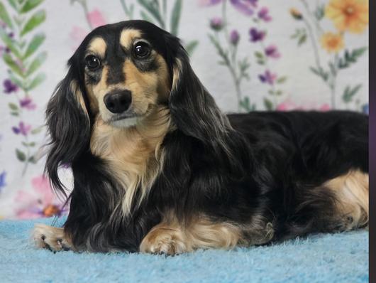 Rowdy is a stunning long-haired black and cream boy here at Snow’s Doxies, originally bred by Heartland Dachshunds. His beautiful coloring and exceptional structure come from his strong champion bloodlines, and his sweet, confident temperament makes him an absolute dream.