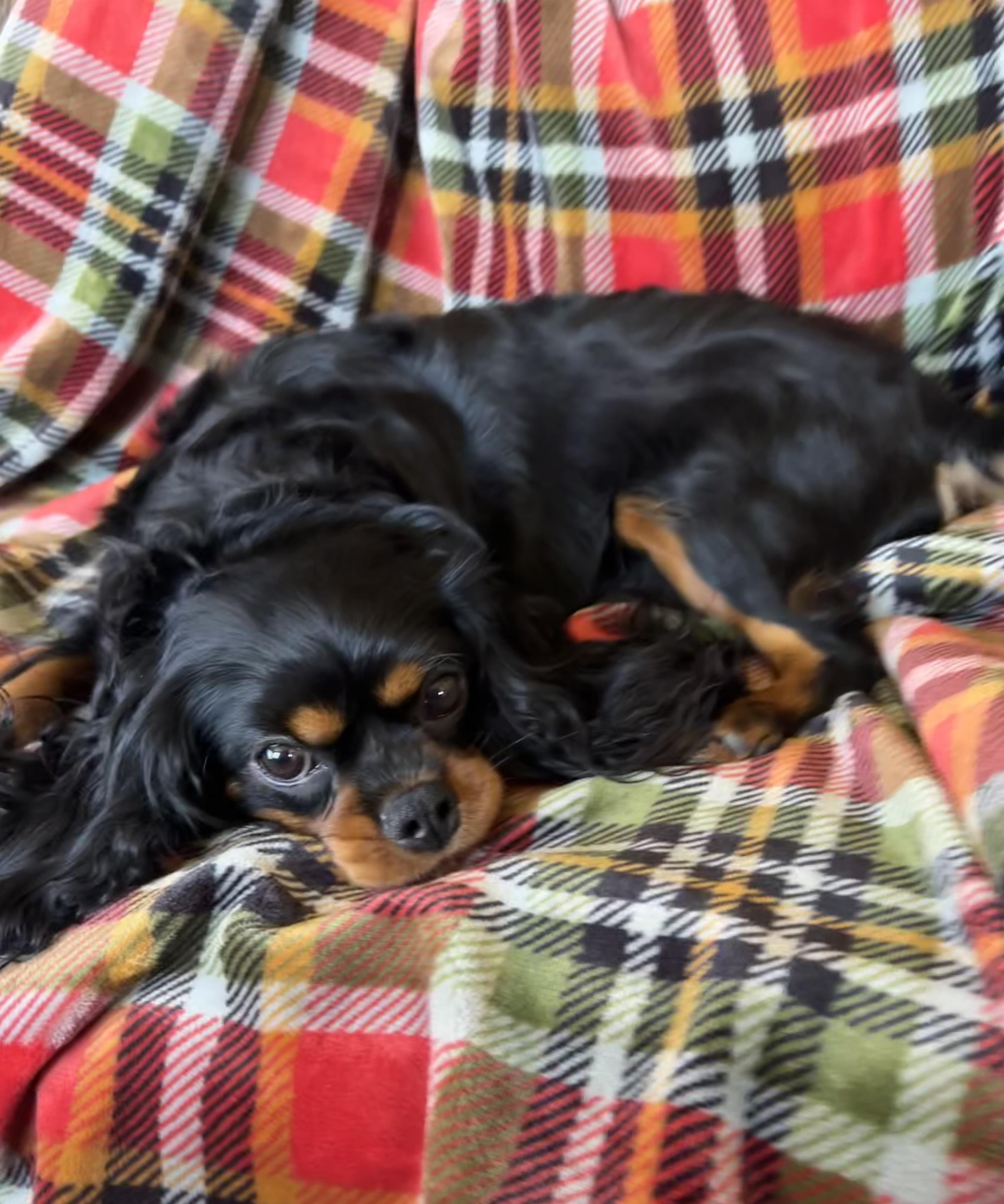 Minnie is a gorgeous black & tan Cavalier. She is purebred, AKC registered, genetically tested, and has the sweetest temperament. This little lady is petite, 13 lbs. and has a glossy, wavy coat.