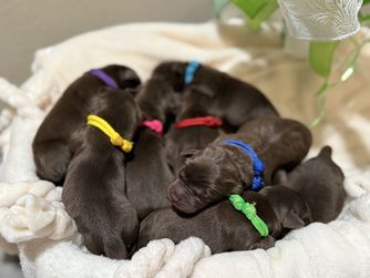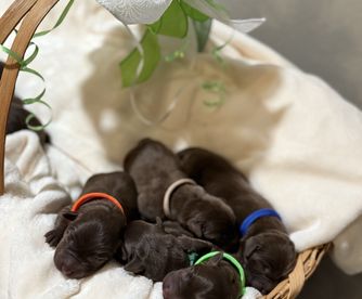 Our puppies include black, chocolate, and yellow. Colors will vary depending on the parent dogs.