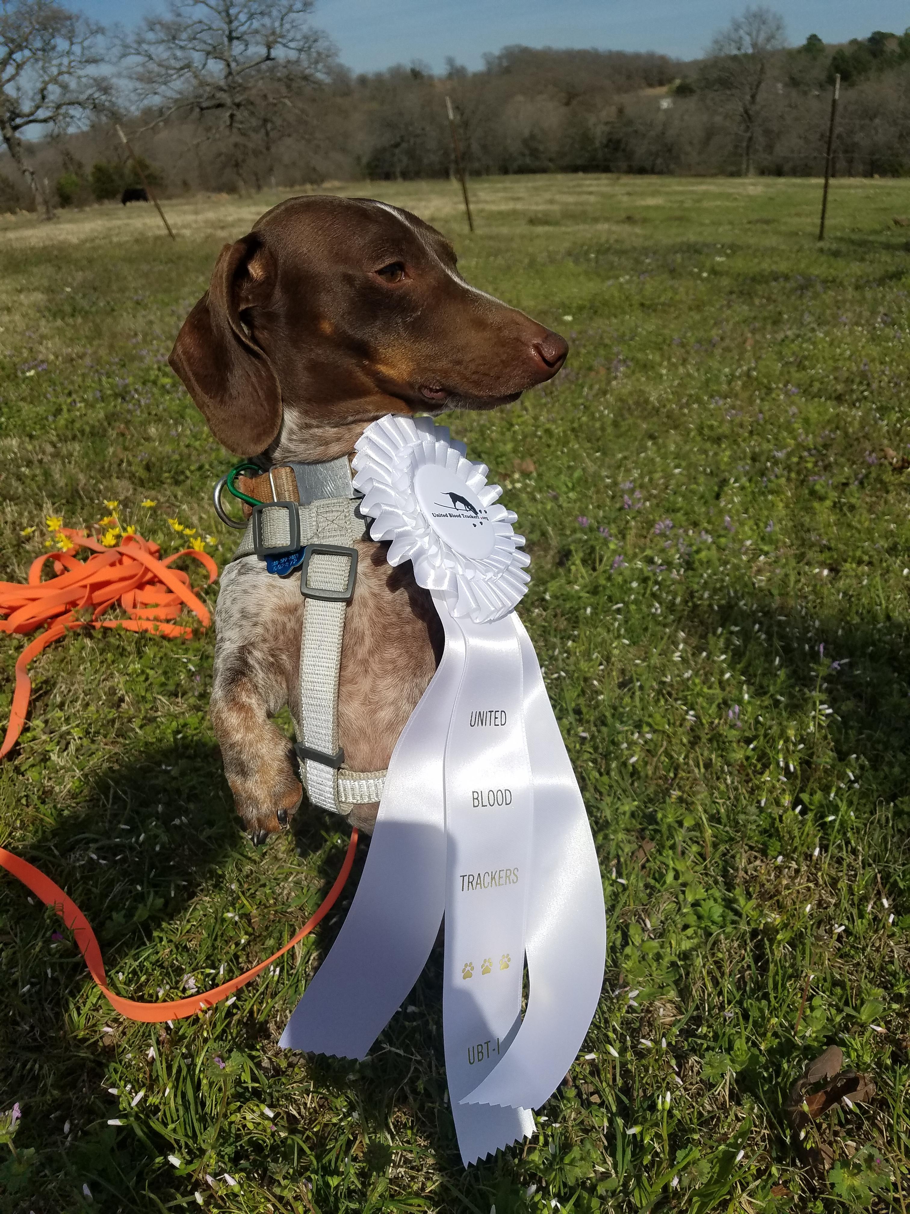 AKC registered Chocolate and tan piebald with ticking. Tracks wounded game and is UBT-1 certified