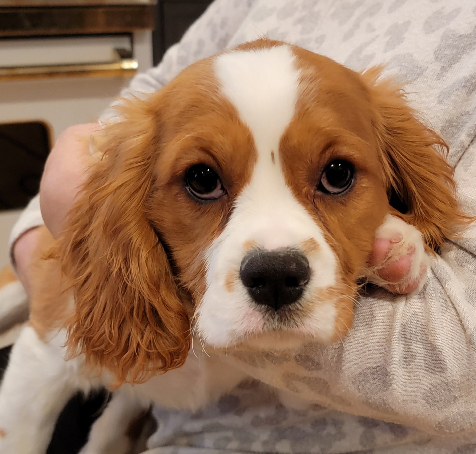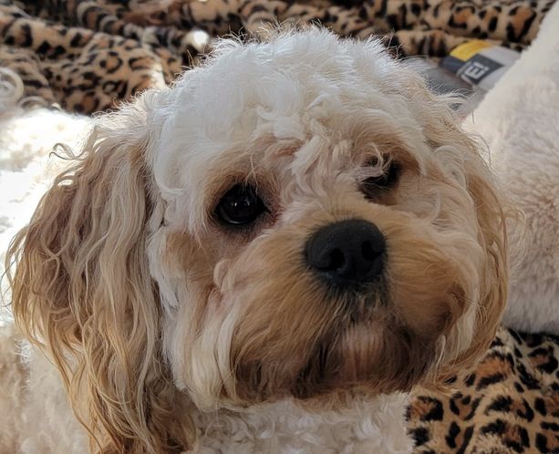 Curly coat like poodle, but head and eyes like Cavalier.