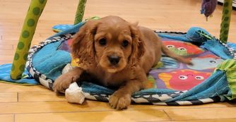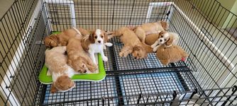 Our Cavapoo puppies include apricot and blenheim. Golden Retriever puppies are light golden. Goldendoodle puppies include cream, apricot, red, chocolate, phantom, merle, and parti. Colors will vary depending on the parent dogs.
