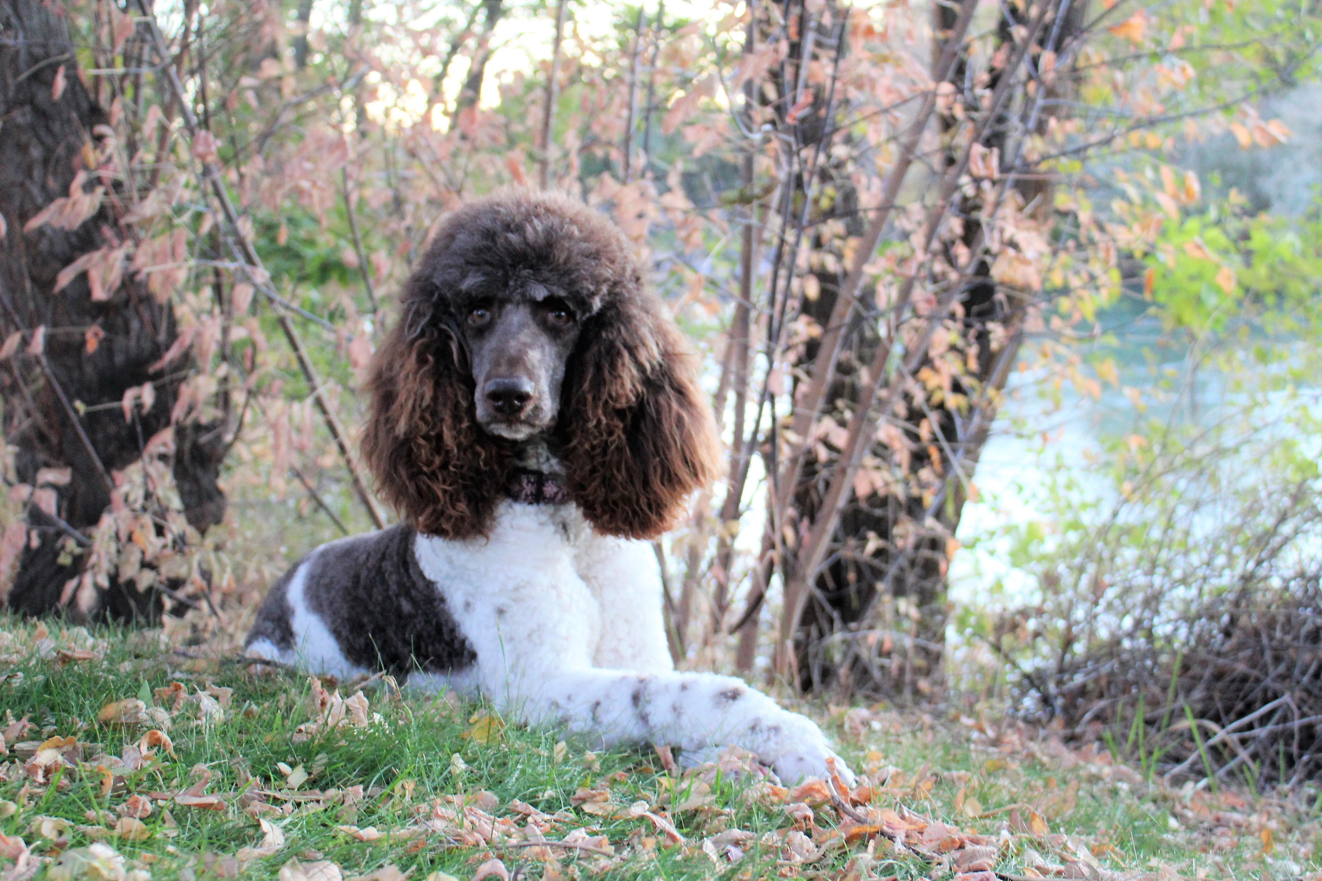 Fitz is a purebred parti standard poodle, with a wonderful personality. He is a very gentle dog and loves to play with young children! What is a parti standard poodle? It is a poodle that is at least fifty percent white, with spots or patches of any other acceptable solid color. It is the rarest color; it is hardly ever seen. As you can see Fitz is a black/white parti poodle weighing in at 63lbs and 24″ tall at the shoulder.
