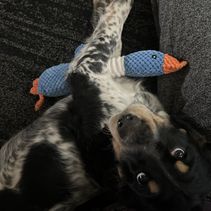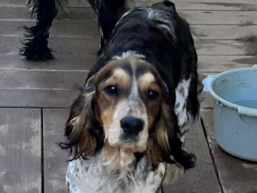 Black-Tri Roan. Eager to please. Intelligent. Very loyal. Loves the water!