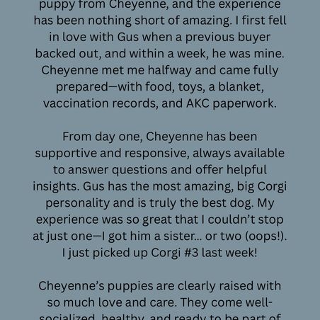 We have the most beautiful little puppy from Sorensen Corgis! Cheyanne was very responsive and helpful with all of our questions. This includes everything from helping us choose the right dog from the litter to questions well after delivery on caring for our new little guy. We would highly recommend them for both the quality of the dogs, but also the human touch in all of the communications and assistance.