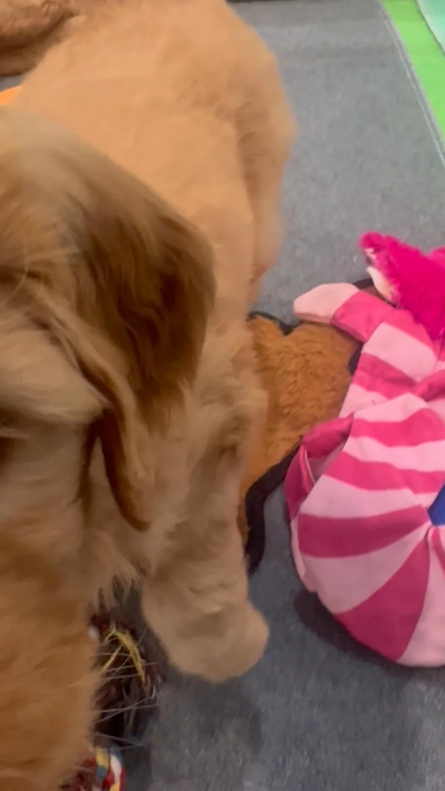 Here is our little black collar boy. He’s so sweet and handsome! He’s a solid darker apricot. The little girl with her head propped on her toy…is gorgeous! She’s very tiny and petite. She luvs to held and have lots of cuddle time.