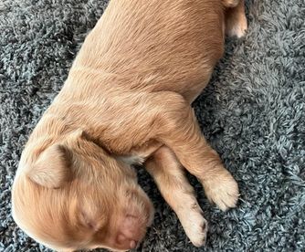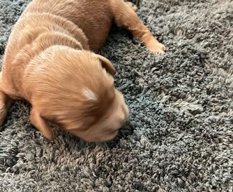 Girl 1 is a Gold cream color puppy with Tuxedo markings. She is very sweet and loves to crawl on her toys.