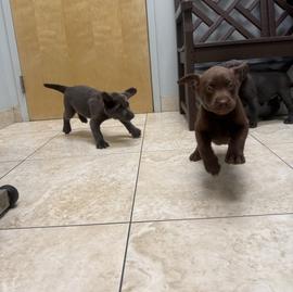 Our Dilute Retriever puppies include silver, charcoal, and champagne. Labrador Retriever puppies include black, chocolate, and yellow. Colors will vary depending on the parent dogs.
