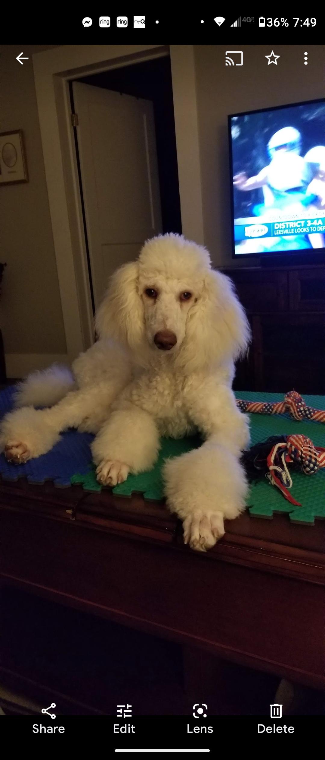 Izzie is a female Poodle. Carefully selected as a great representative of her breed, Jeanette decided to make her part of their program. Jeanette has passed Good Dog’s screening process, which involved a review of their breeding practices, environment, and the mental and physical health of their dogs.