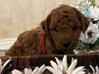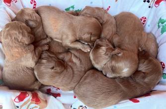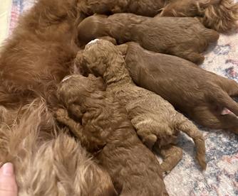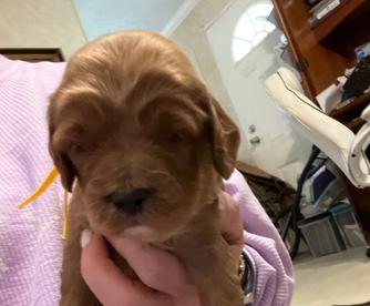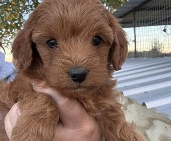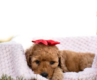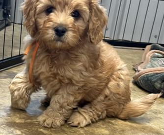 Our Cavapoo puppies include black and tan and red. Goldendoodle puppies include apricot, red, and parti. Colors will vary depending on the parent dogs.