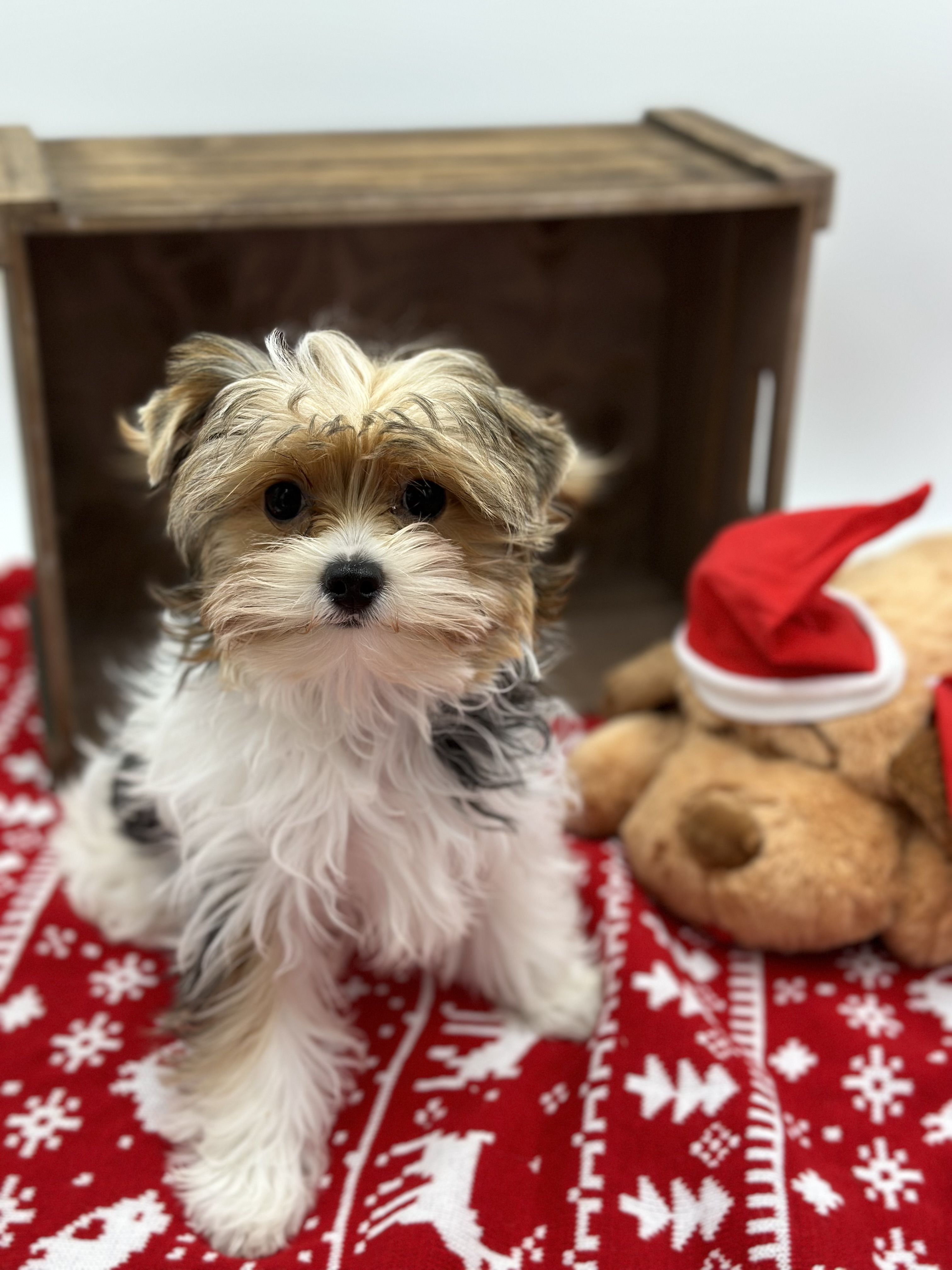 Our Yorkshire Terrier puppies are black and gold. Goldendoodle puppies include apricot and red. Colors will vary depending on the parent dogs.