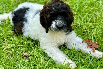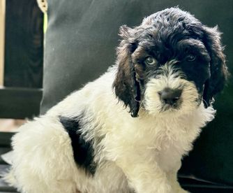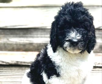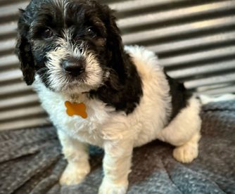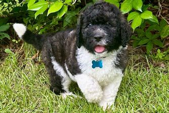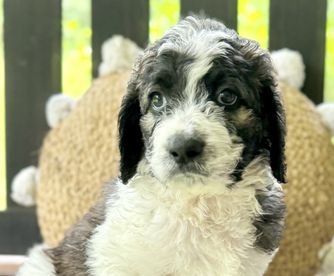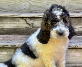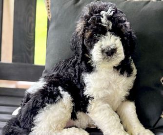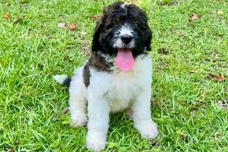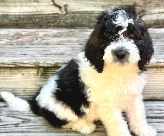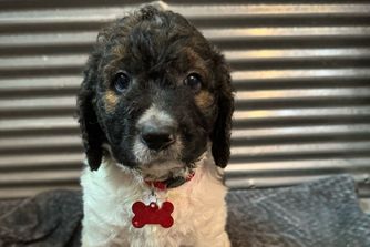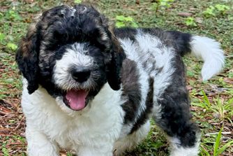 Our Goldendoodle puppies include cream, apricot, red, and parti. Saint Berdoodle puppies include sable, black and white, rust and white, and mahogany and white. Colors will vary depending on the parent dogs.